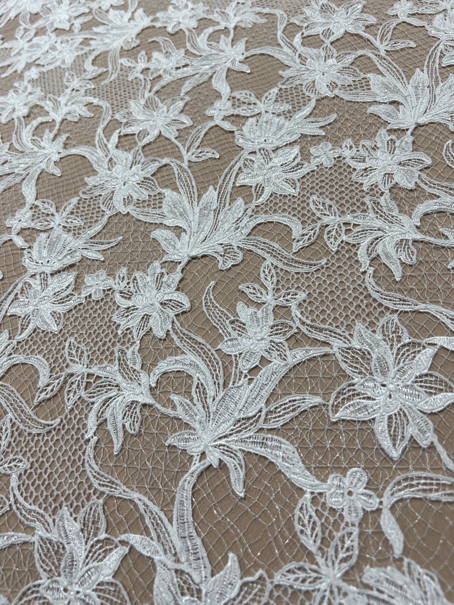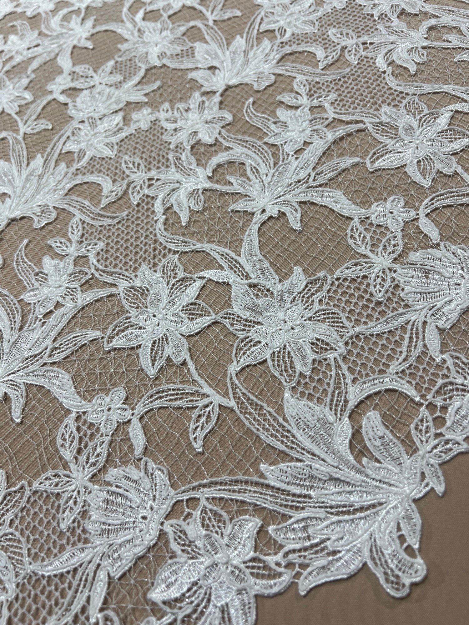 Fabric type: Bridal fabric with fine floral embroidery and veil-inspired design