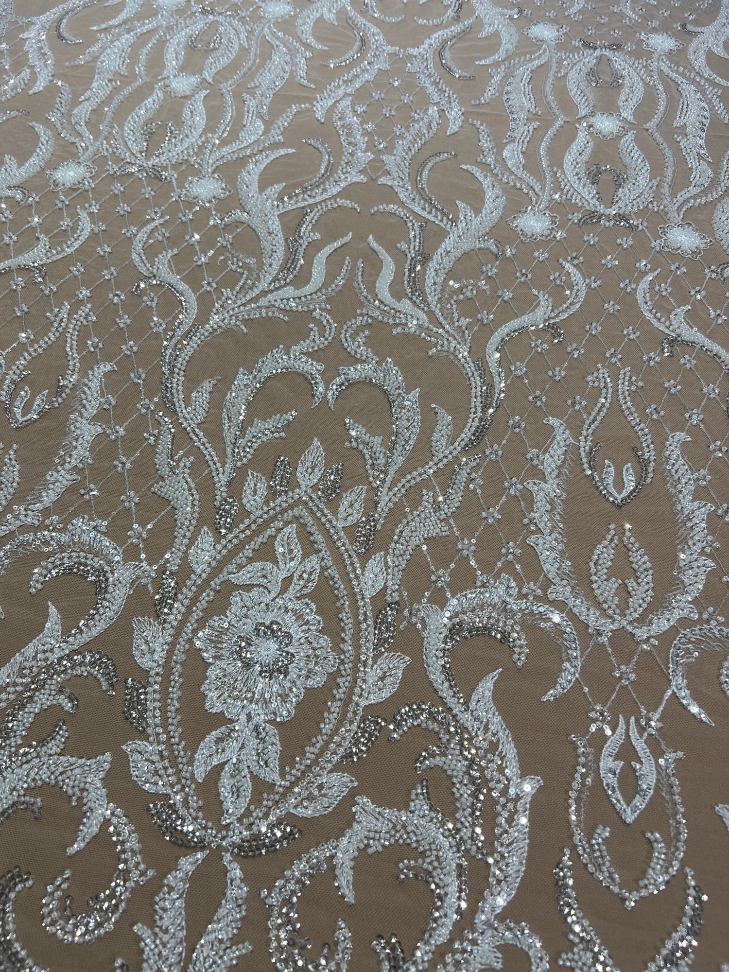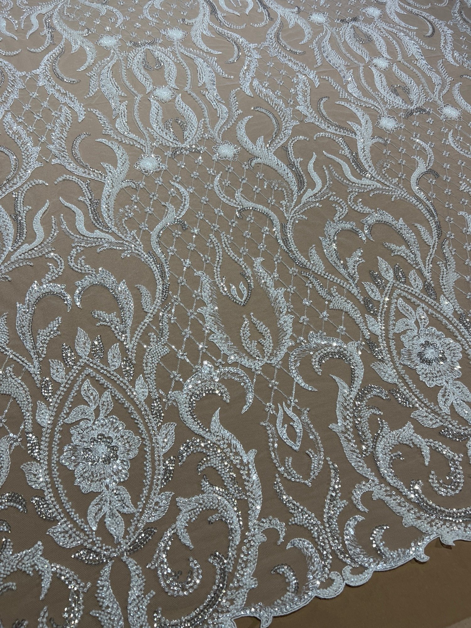 Design: Gracefully arranged floral pattern delicately embellished with beads for light-catching sparkle