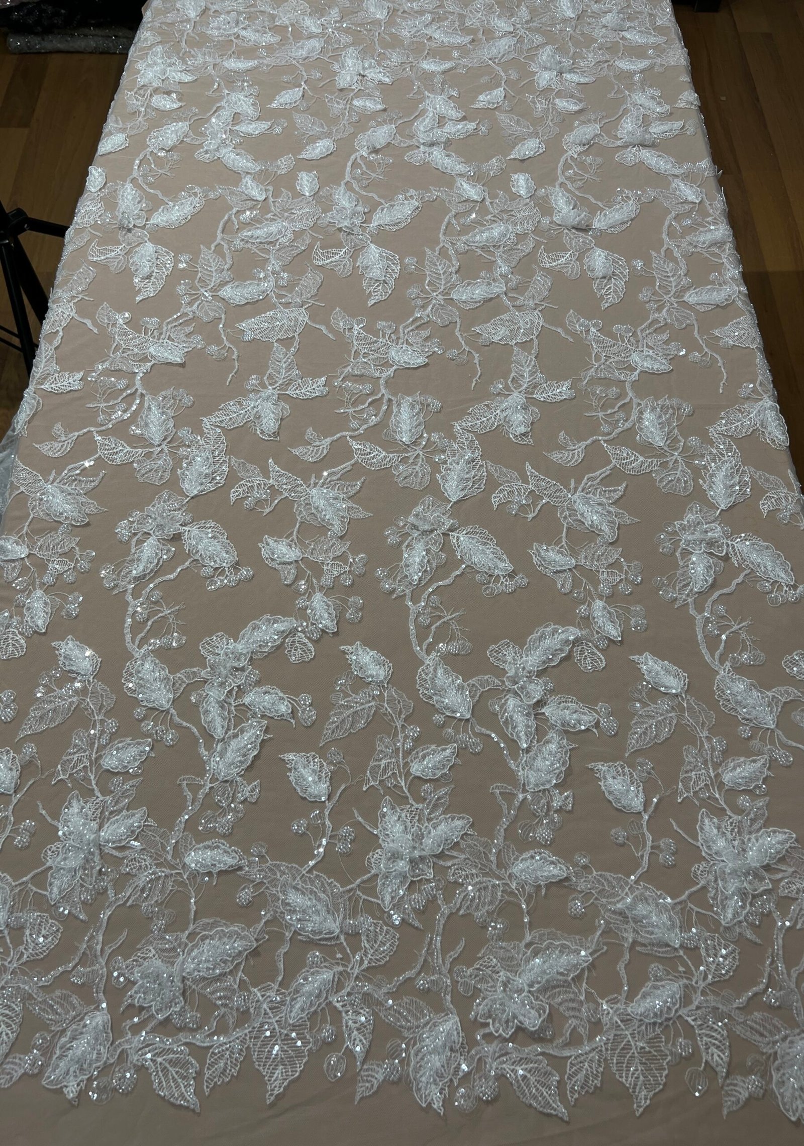 Fabric type: White lace with 3D leaf appliqués, beads, and embroidery