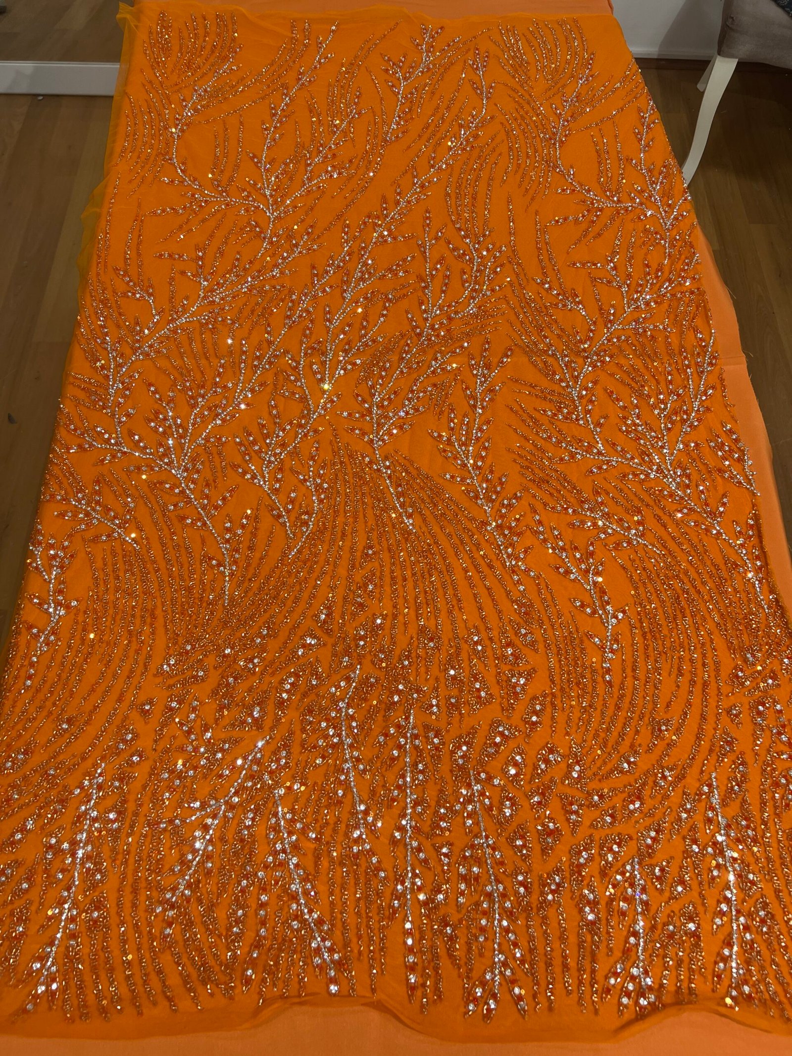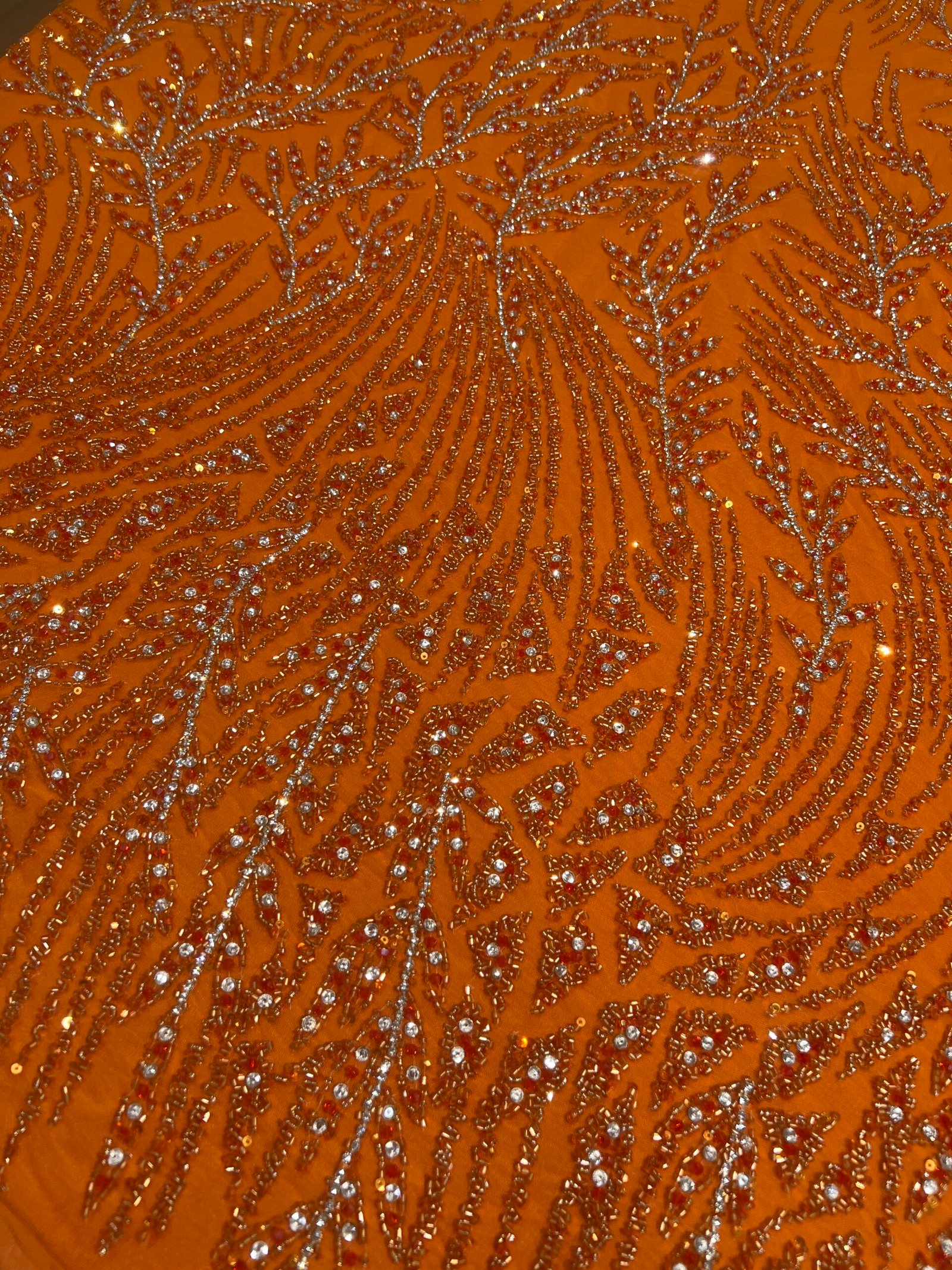 Bluma is a vibrant statement fabric, featuring artistic messy lines on orange net, enhanced with shimmering silver stones for bold contrast and couture sparkle.