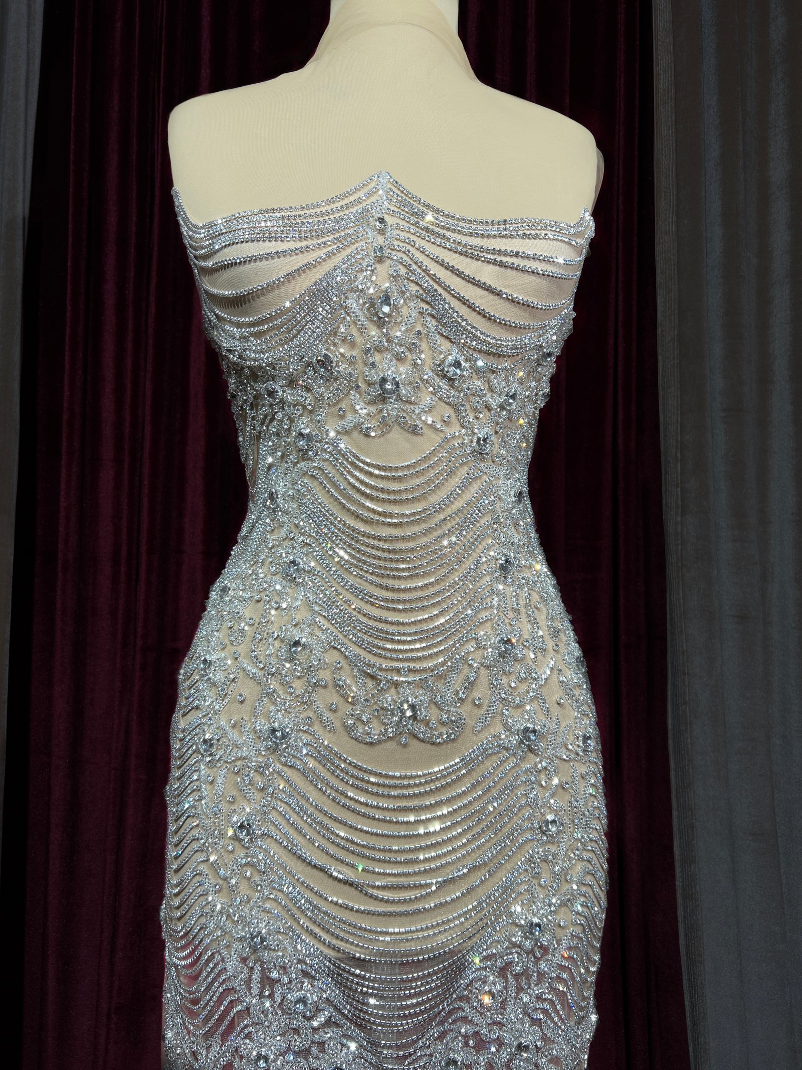 Calista combines elegance and movement, with shimmering silver stones that drape gracefully across nude tulle. Floral stone motifs add romance, creating a couture panel of sparkle and charm.