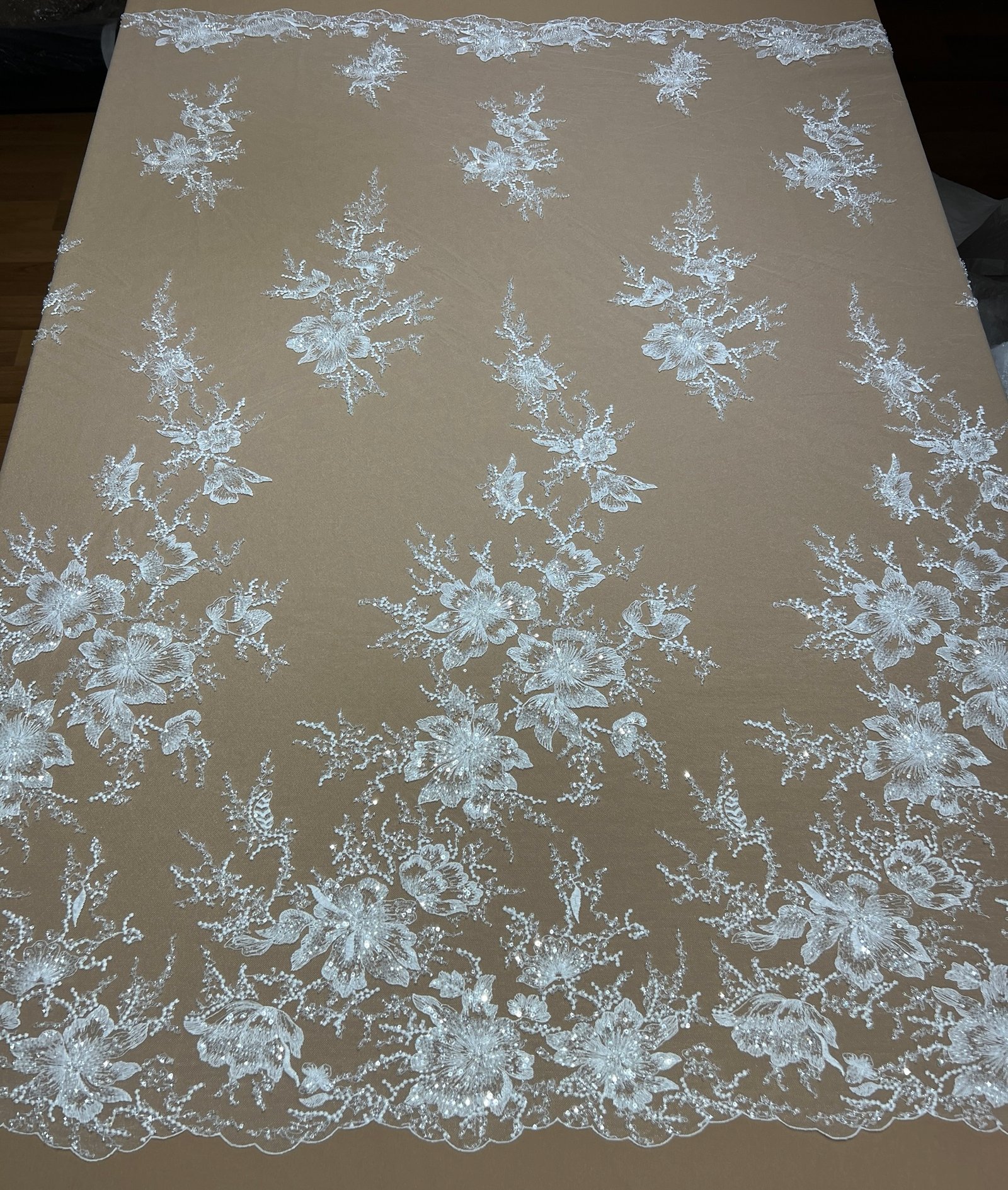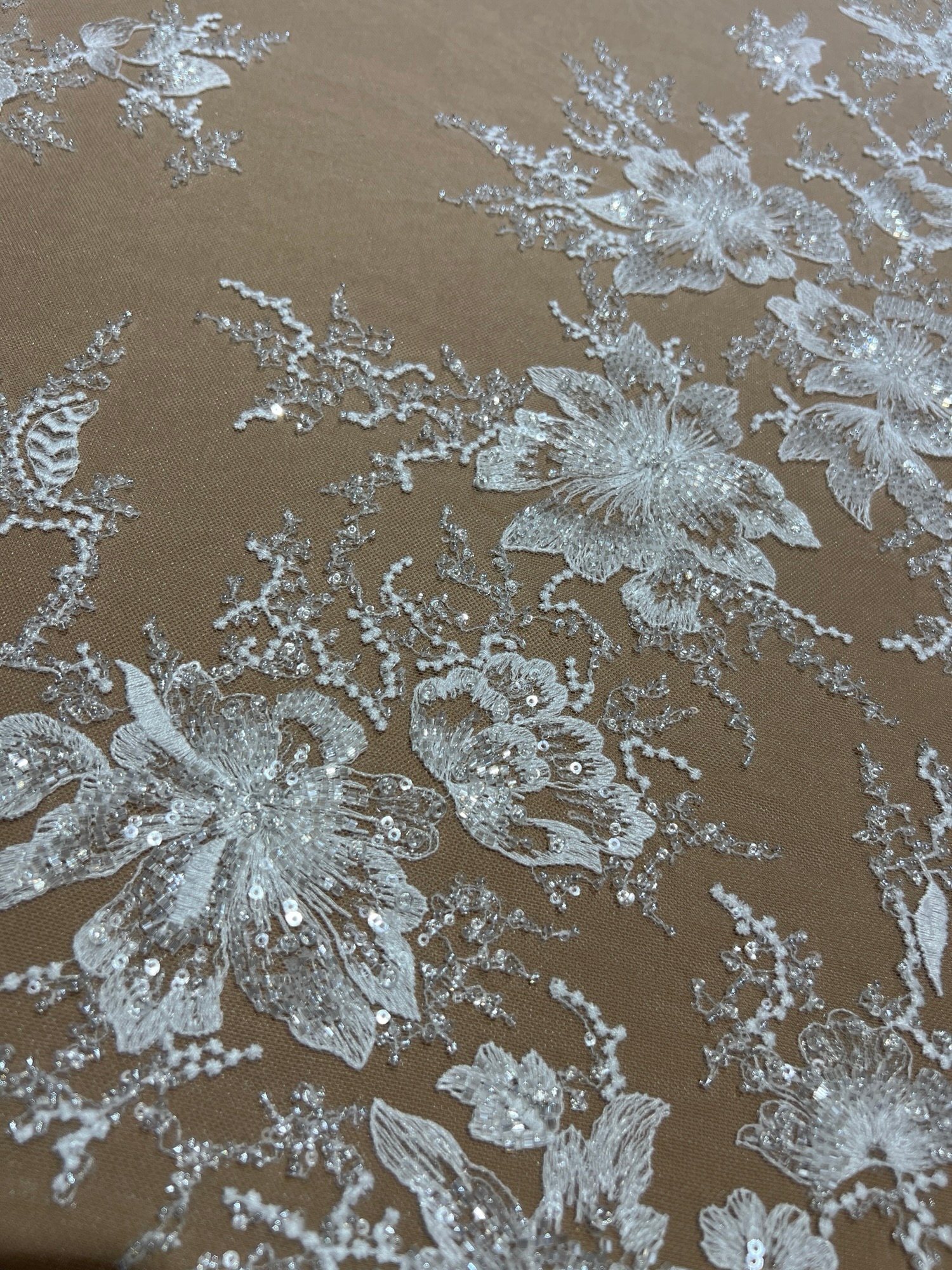 • Texture: Soft lace base with heavy beadwork and raised florals for couture dimension