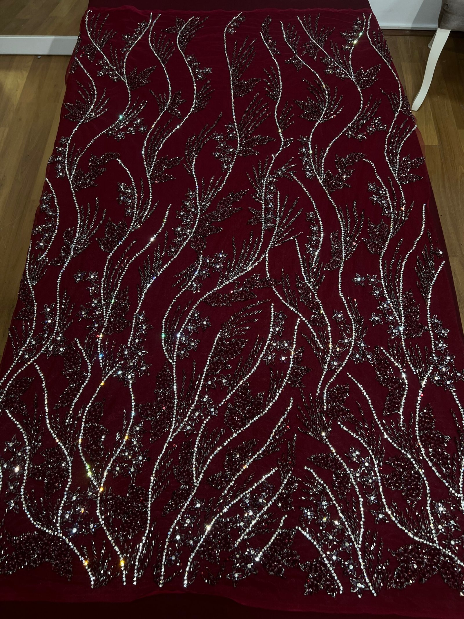 Edenelle brings nature’s elegance to couture, featuring a leaf-inspired line pattern on rich bordo red fabric. Embellished with red beads and silver stones, it exudes refined sparkle and organic charm.