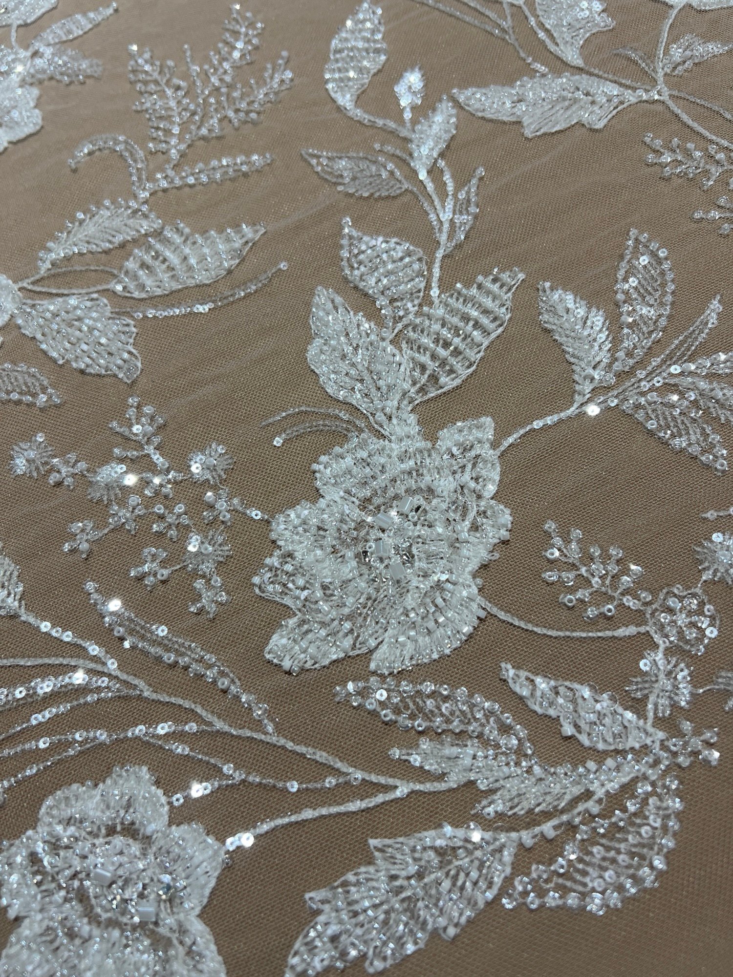 • Fabric type: Bridal lace with floral and leaf motifs, accented by bead embroidery