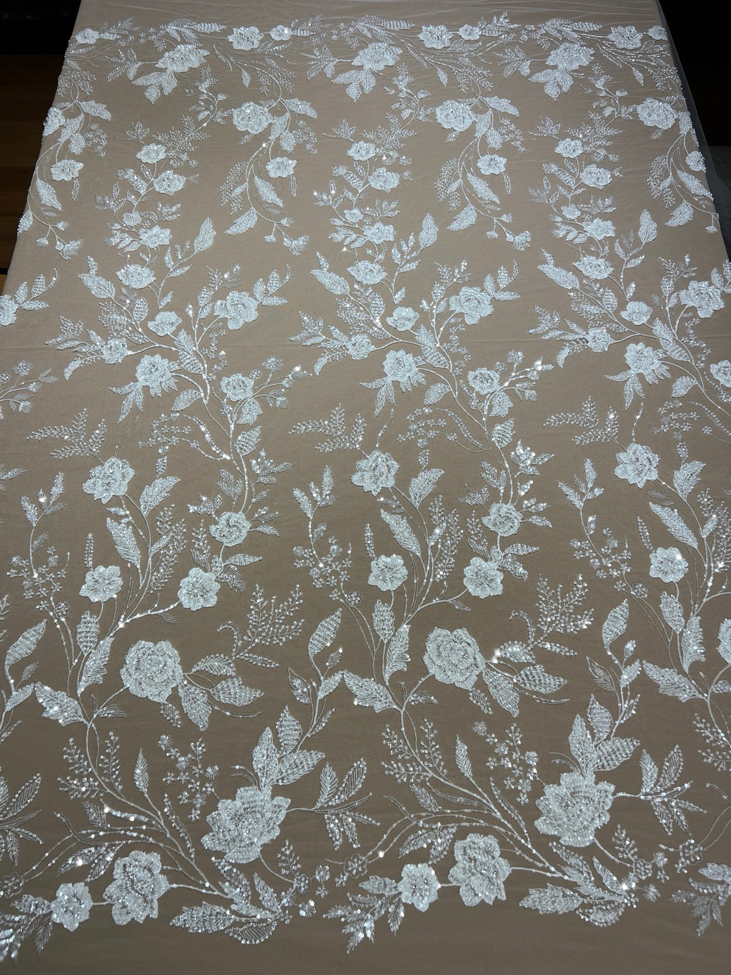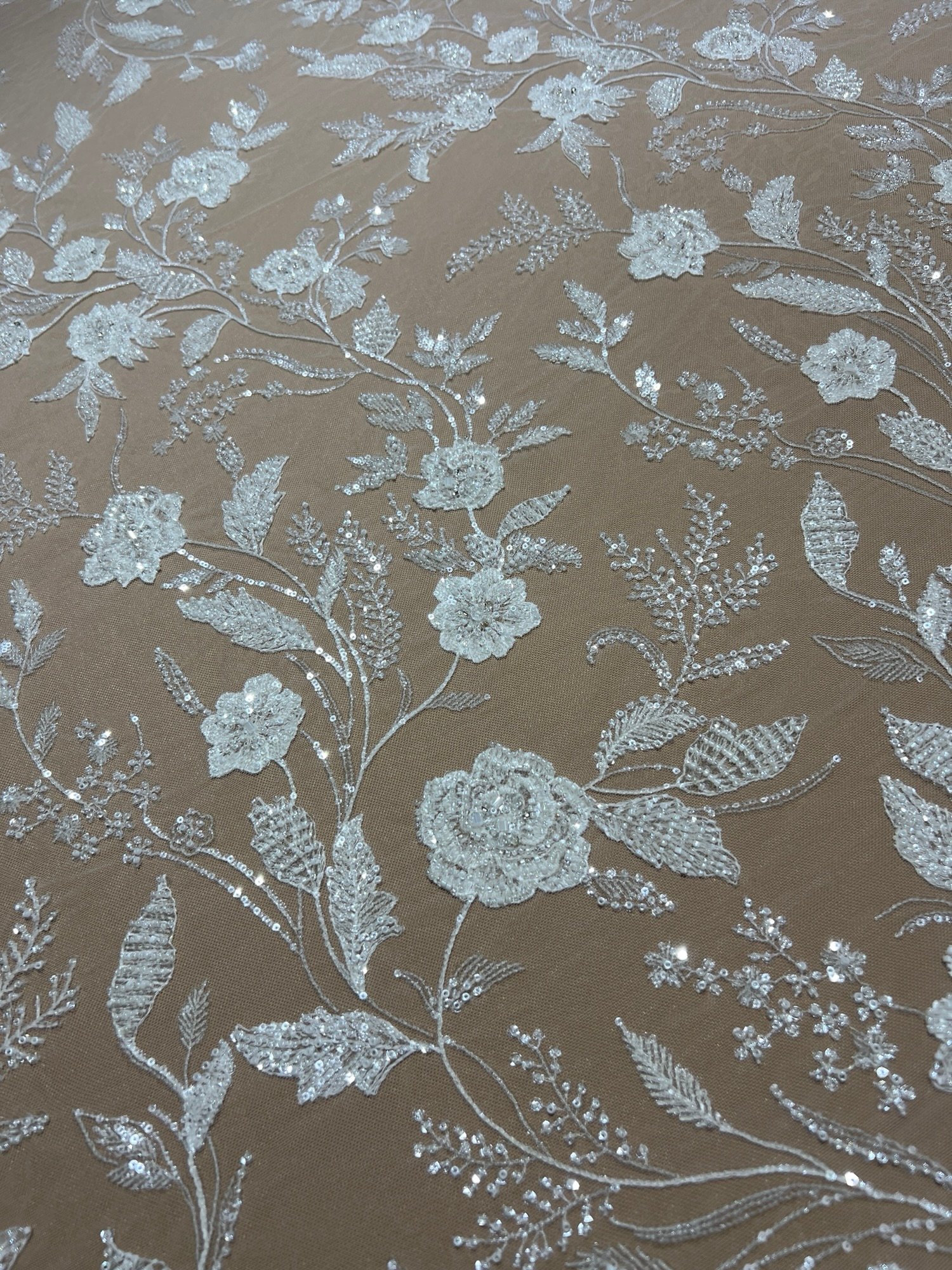 Celebrate elegance and romance with Eli, a bridal lace that harmoniously blends florals, leaves, and delicate beadwork. Designed for gowns of distinction, it radiates timeless grace and luminous beauty.