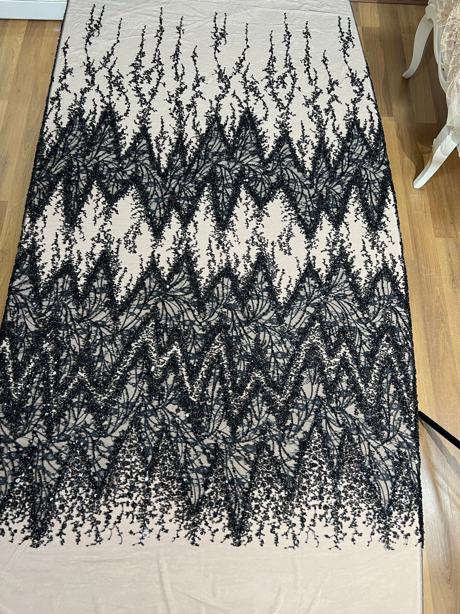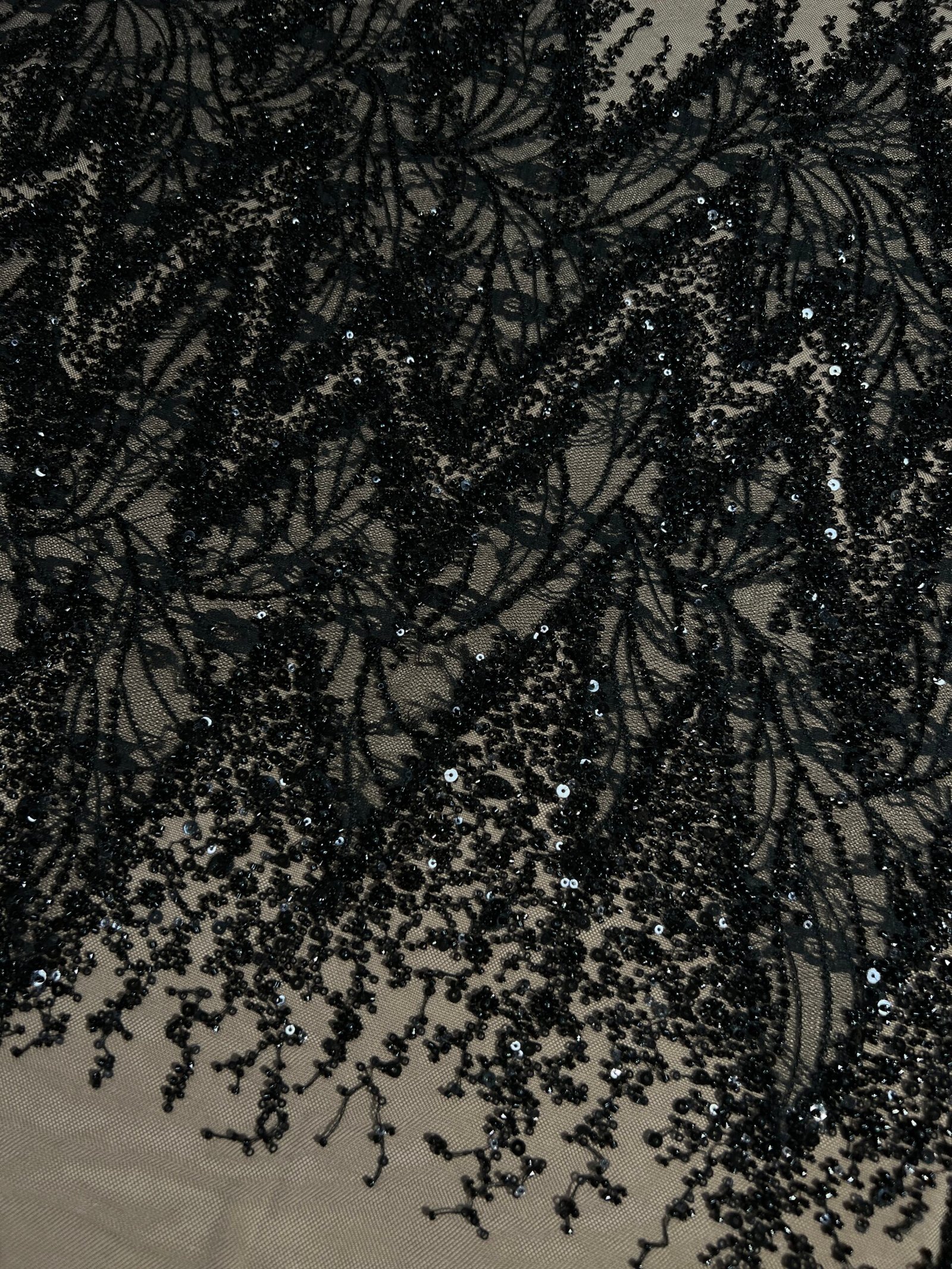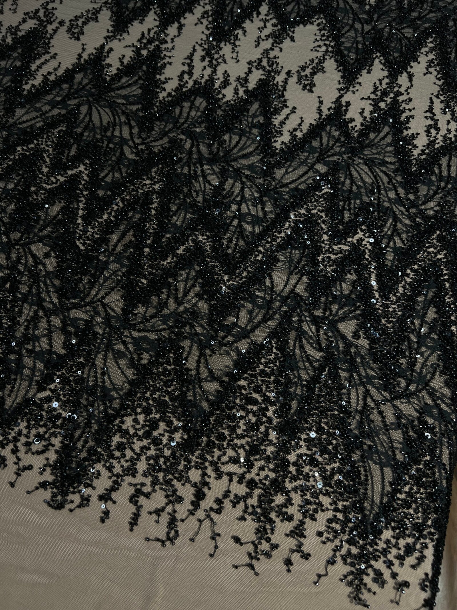 • Fabric type: Black tulle with French lace cut-outs and bead embellishments