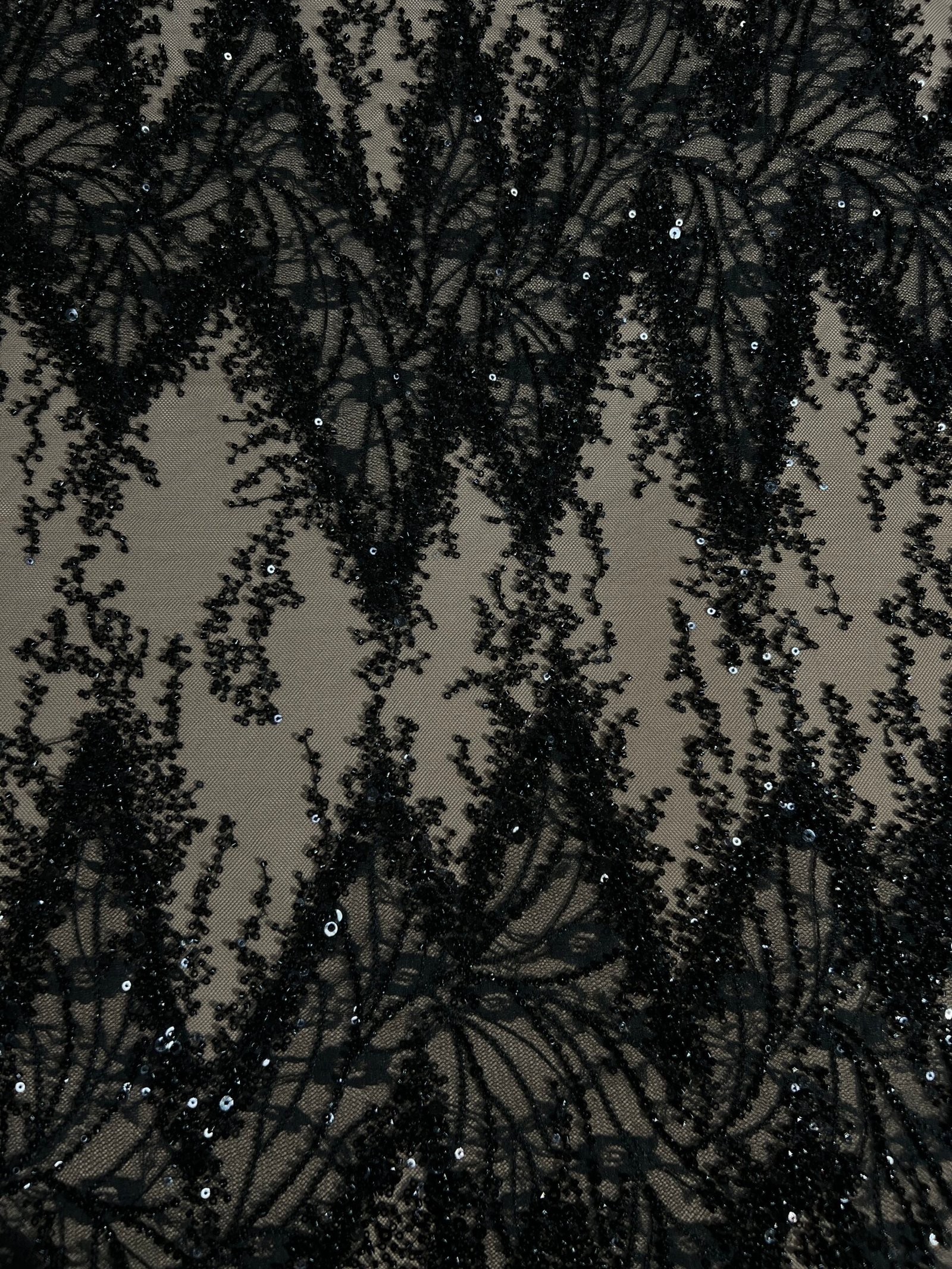 Sophisticated and striking, Eliana combines the elegance of French lace with the bold allure of black tulle. Featuring geometric cut-outs embellished with delicate beads, this fabric is crafted for couture designs that radiate modern refinement.
