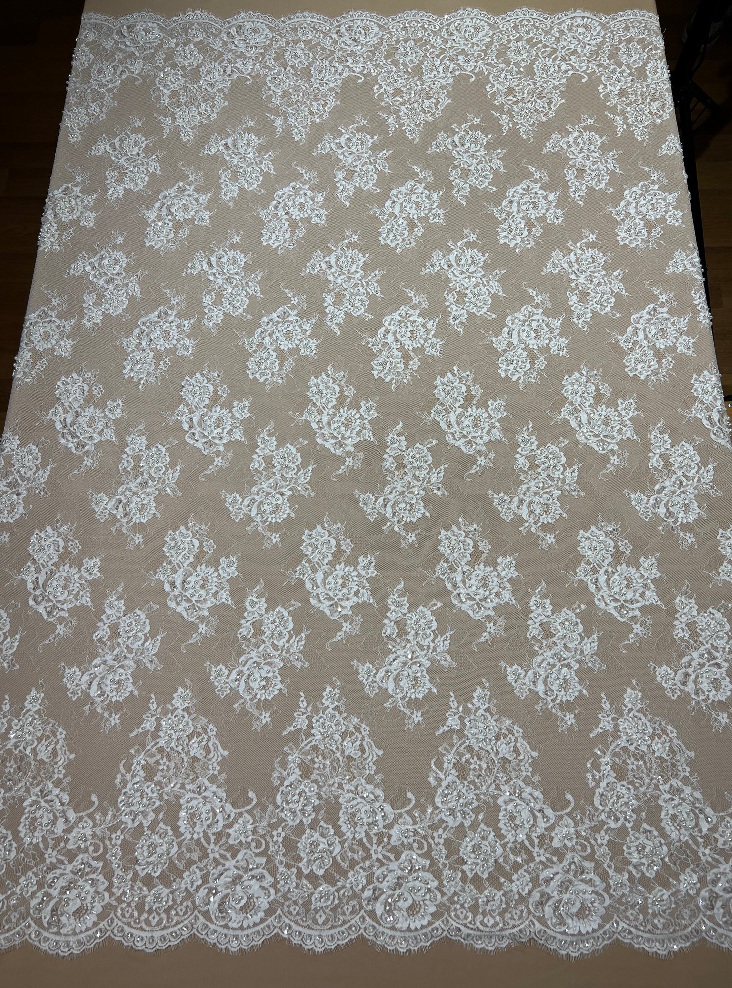 Fabric type: French lace bridal fabric with pearl embellishments