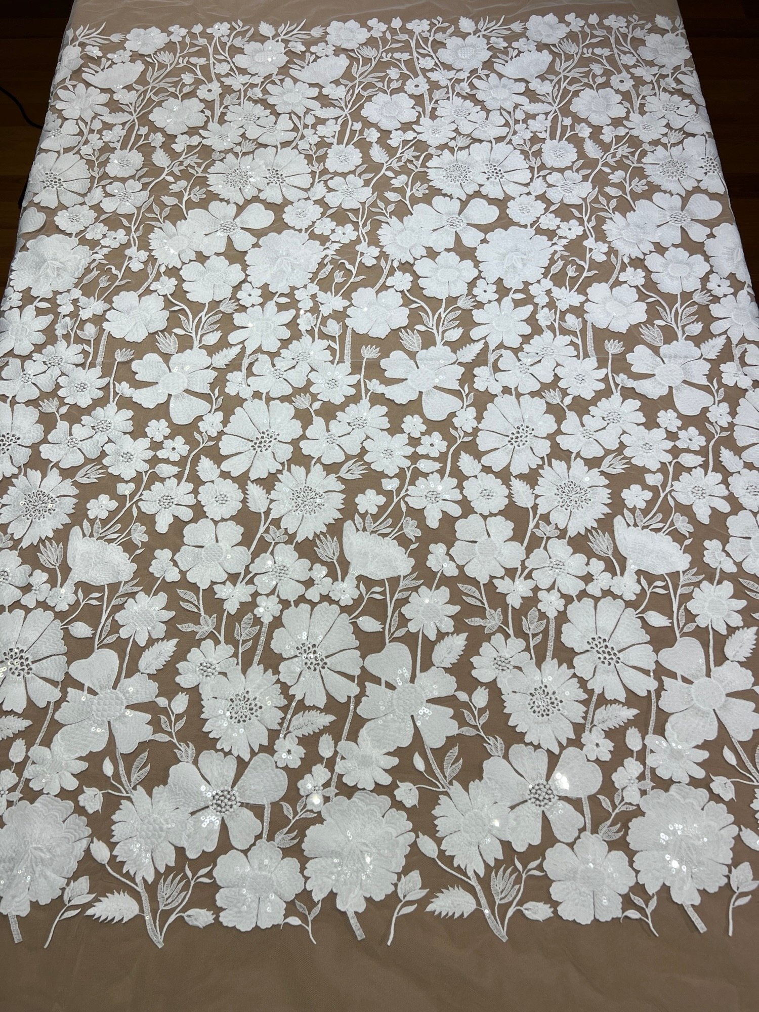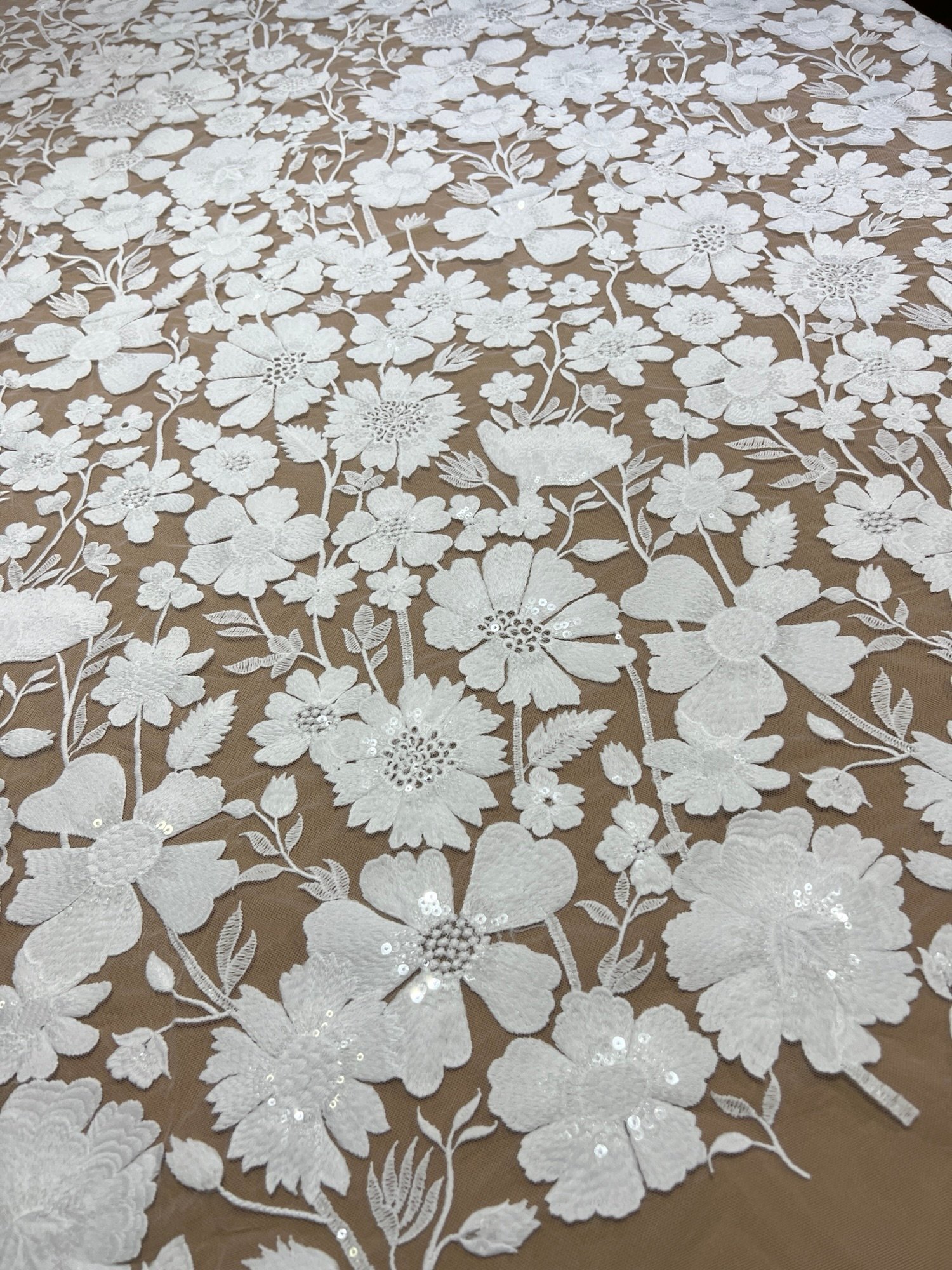 Fabric type: Bridal lace with cotton-flower embroidery and beaded accents