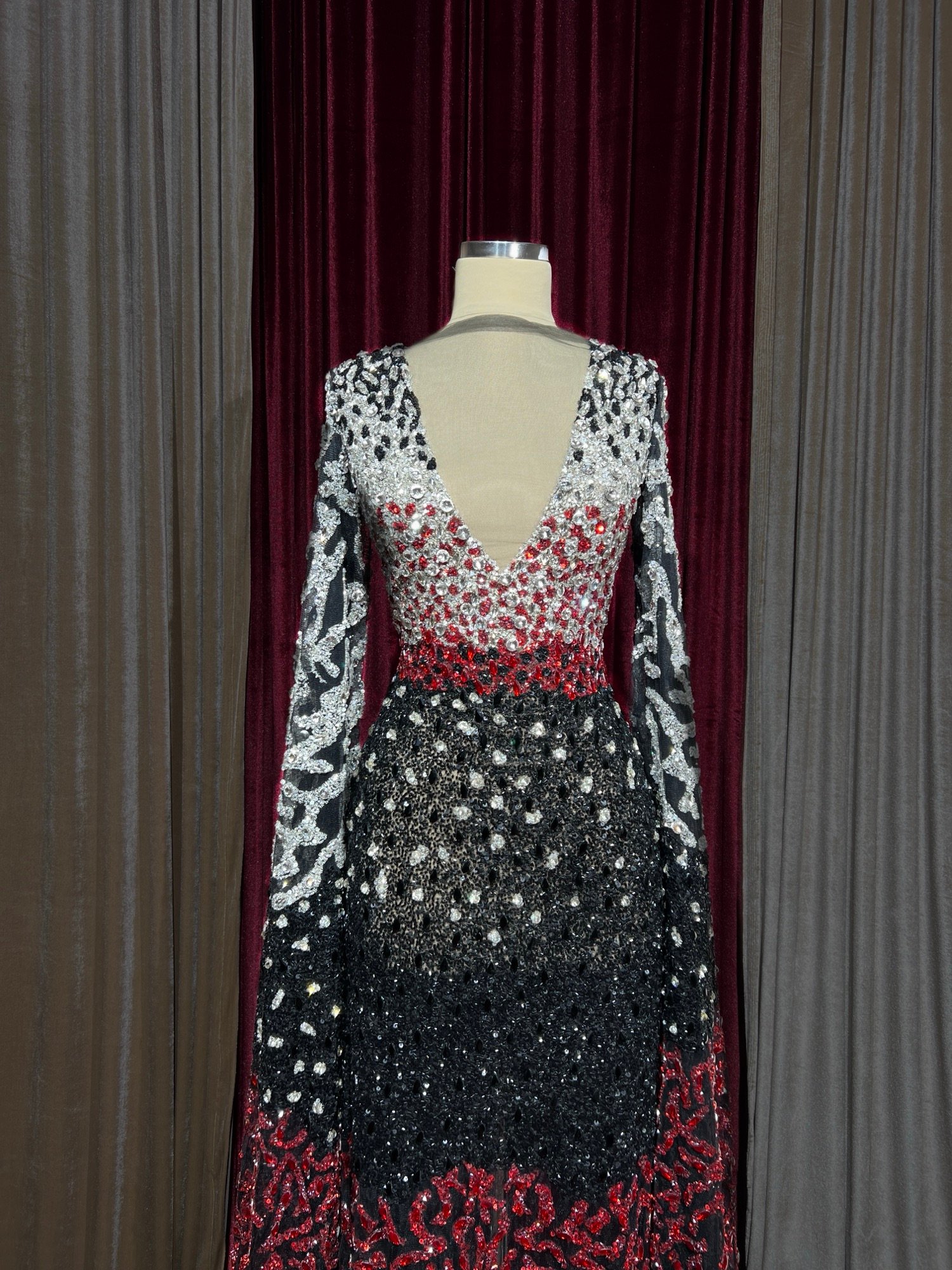 Embroidered on a sheer black tulle base, the design unfolds in an ombre cascade of beads, seamlessly blending red, black, and silver tones. This bold gradient captures both mystery and brilliance, creating a powerful visual effect that shifts with every glance.
