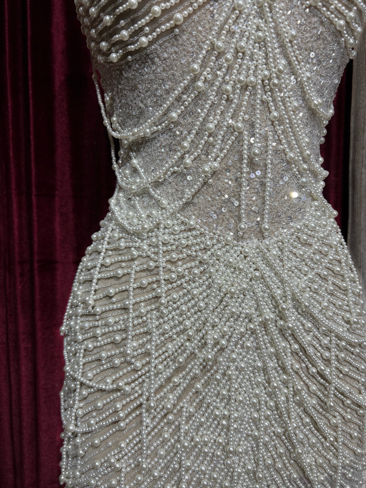 Embellishment: Intricately arranged pearls in sculptural drapes and linear patterns create a chandelier-like effect across the gown, elongating and sculpting the silhouette.