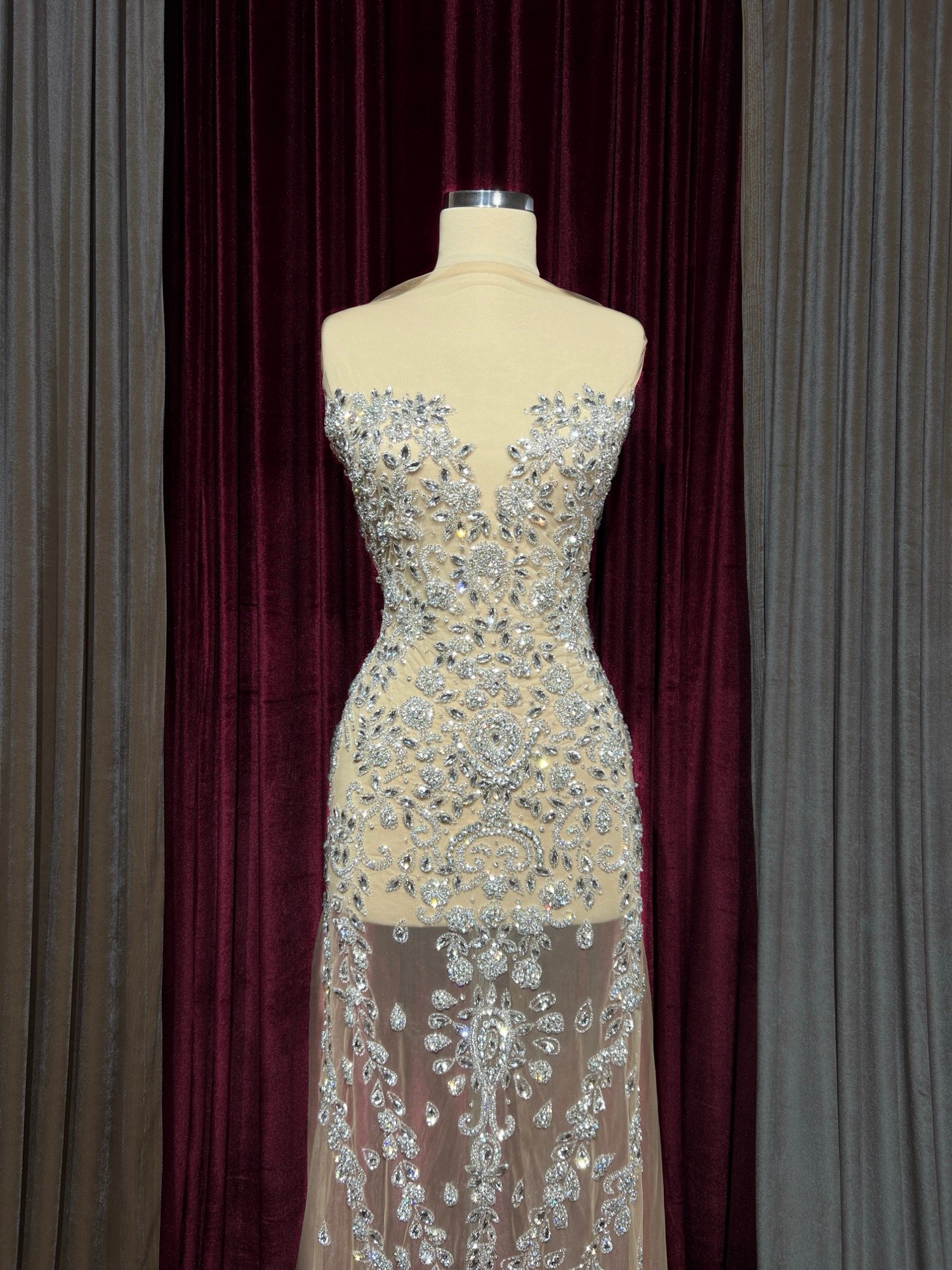 Fabric type: Nude tulle dress panel with crystal-like silver stone embellishments