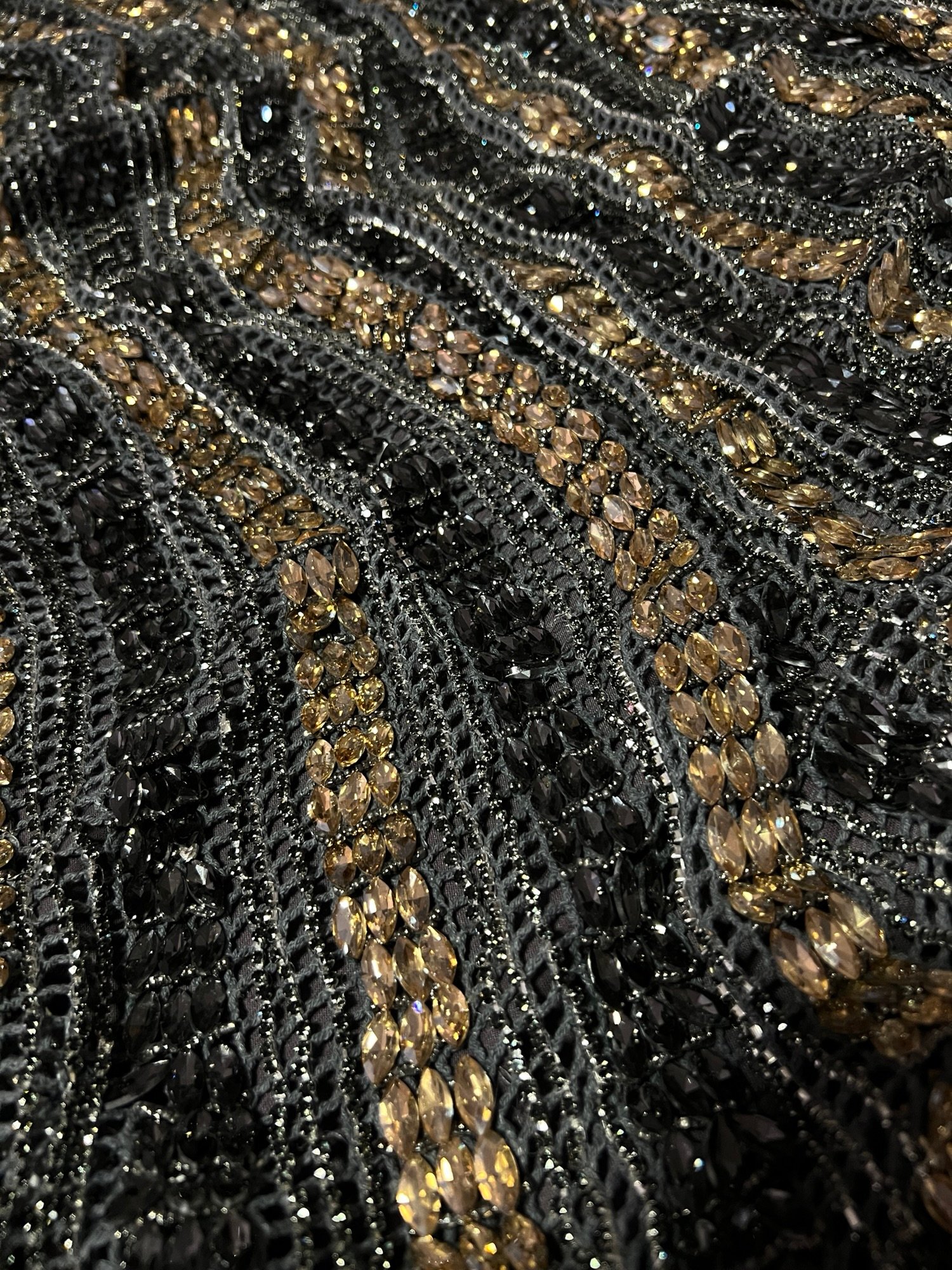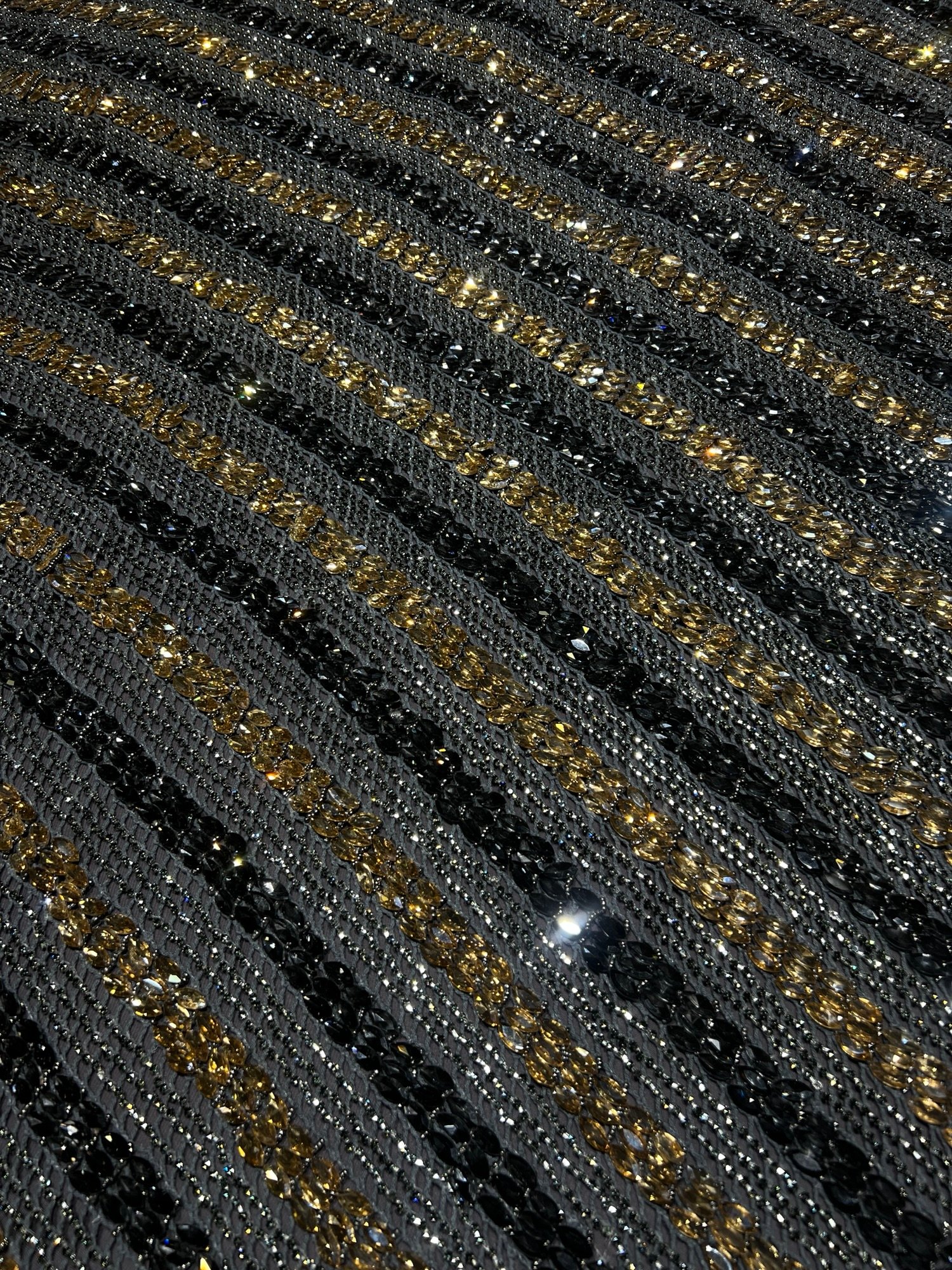 Introducing Katalina, a statement fabric that captures the spirit of opulence and strength. This black and gold beaded mesh is a celebration of modern luxury—where brilliance and refined craftsmanship merge to create an aura of bold sophistication. Perfect for designers seeking to make a lasting impression with texture, light, and movement.