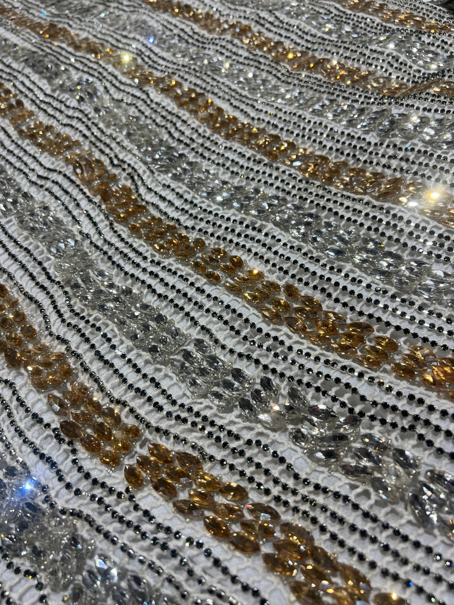 Colour & Fabric: Jet-black and white mesh base enriched with alternating rows of metallic gold and silver beads.