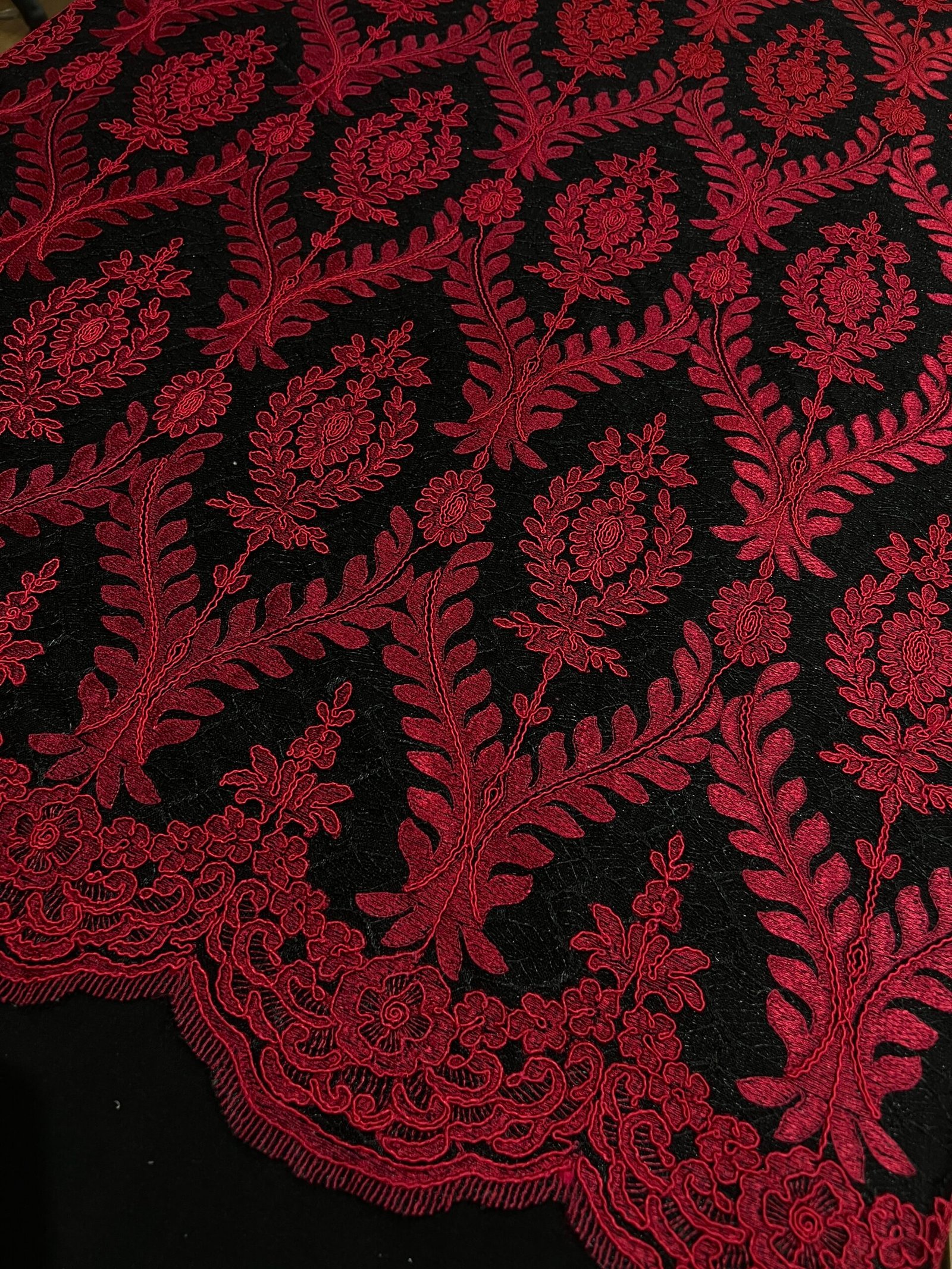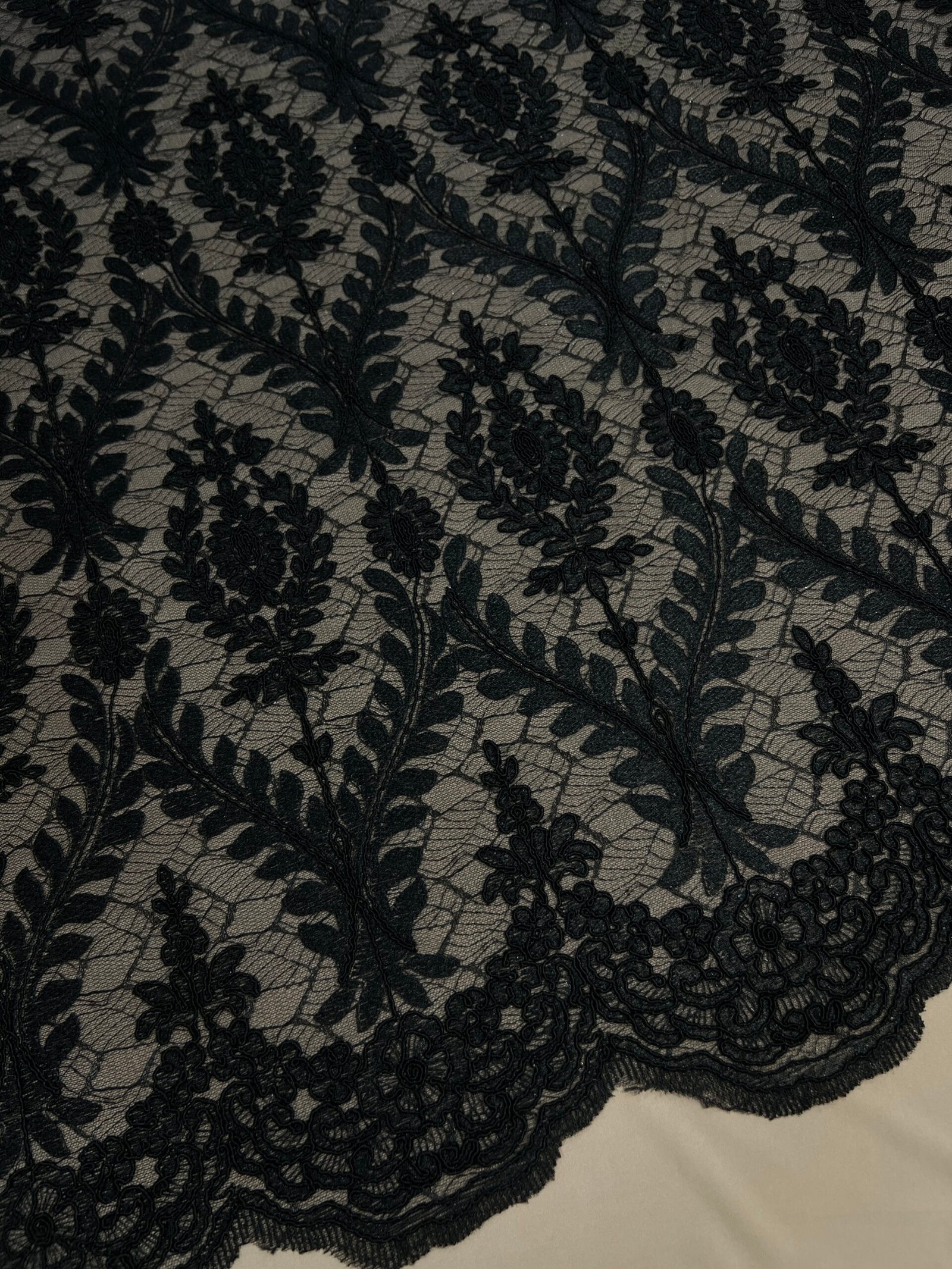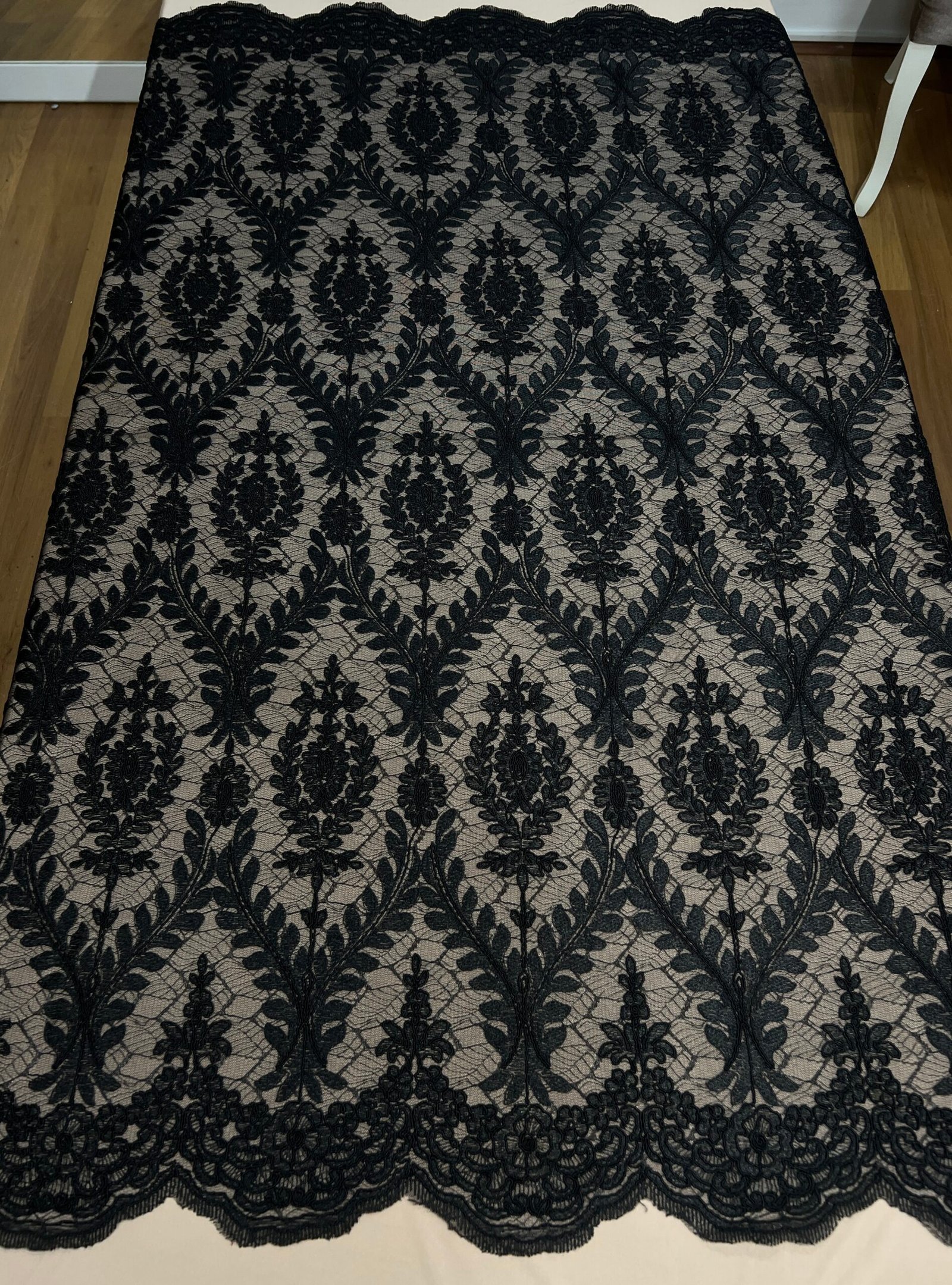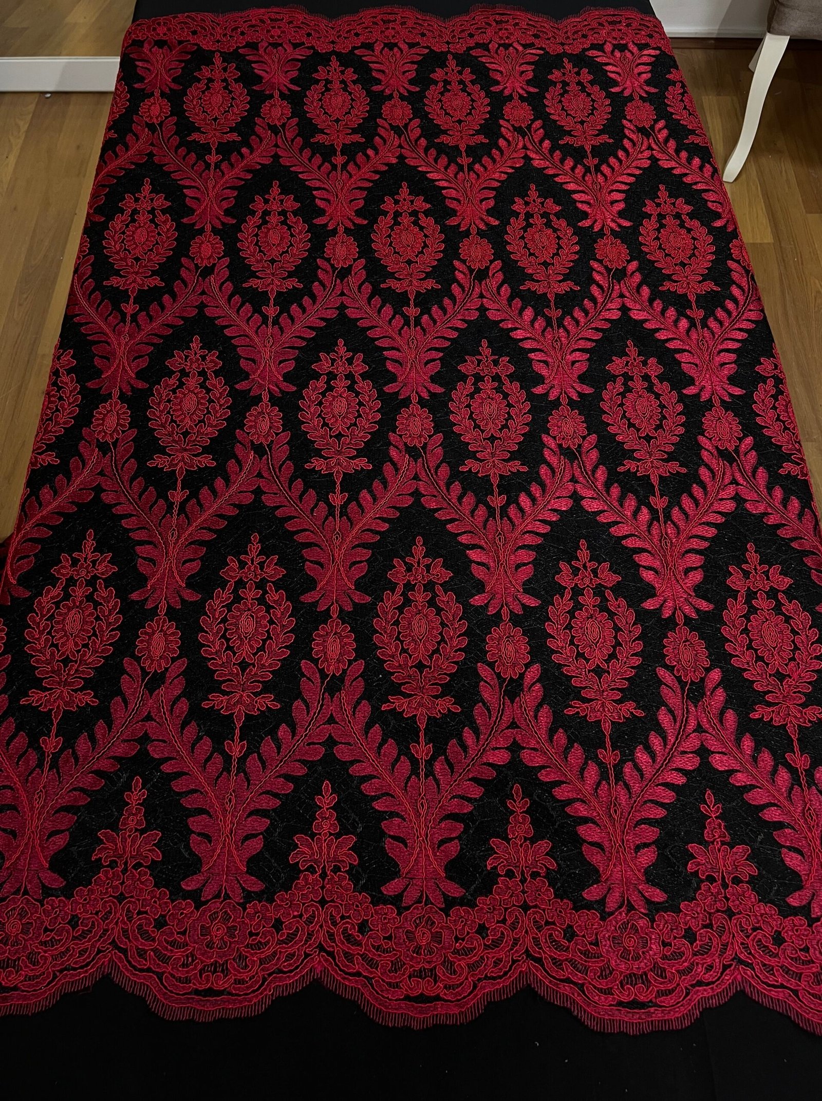 Fabric type: French lace with symmetrical embellishments and cordon embroidery