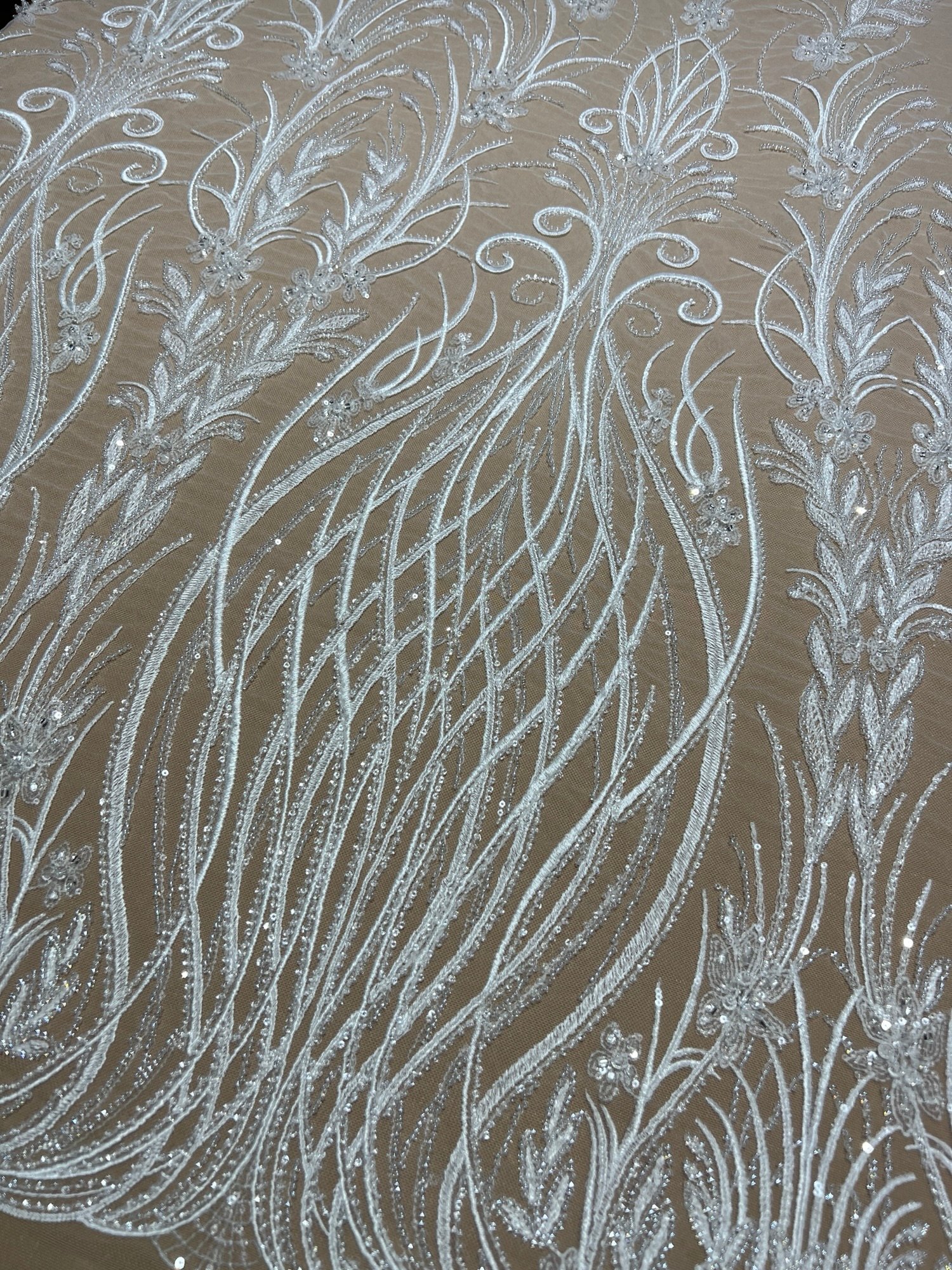 Graceful and dramatic, Lyla is a couture bridal lace designed to capture movement and light. Its sweeping plume-like motifs and delicate embroidery create a fabric that feels both ethereal and powerful — perfect for brides who want a gown that leaves a lasting impression.