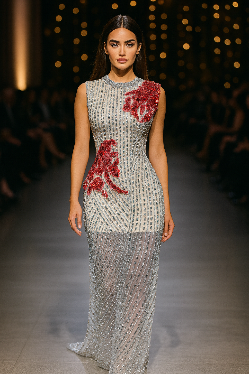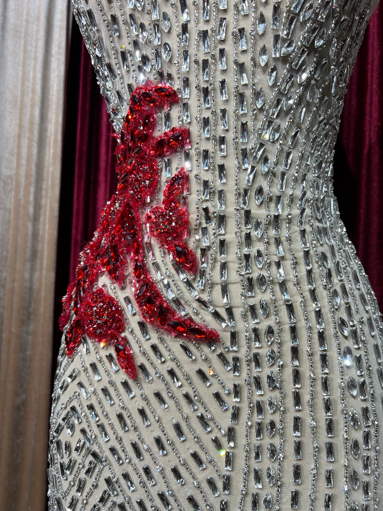 Lysandra is a bold fusion of geometry and artistry. Featuring square stones in a modern linear arrangement and delicate red appliques of flowers and vines, this panel offers striking contrast and couture-level detail for designs that demand attention.