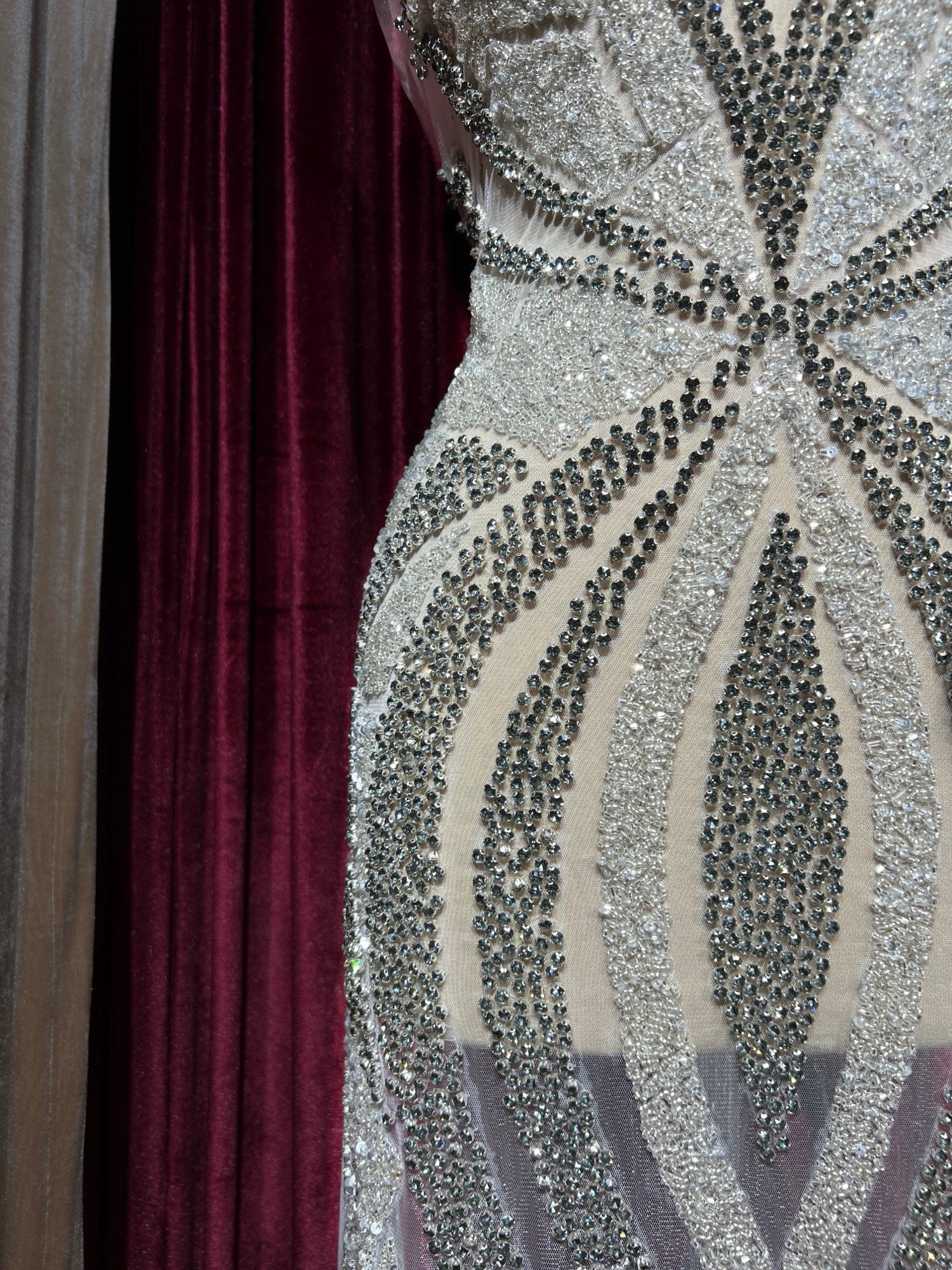 Lyselle is crafted for couture elegance, with shimmering stones arranged in graceful lines that converge toward the center, creating depth, balance, and a refined slimming effect. This panel set transforms fabric into a statement of structure and shimmer.