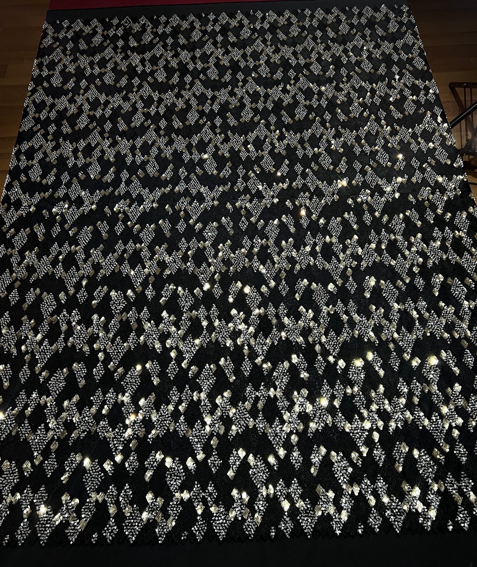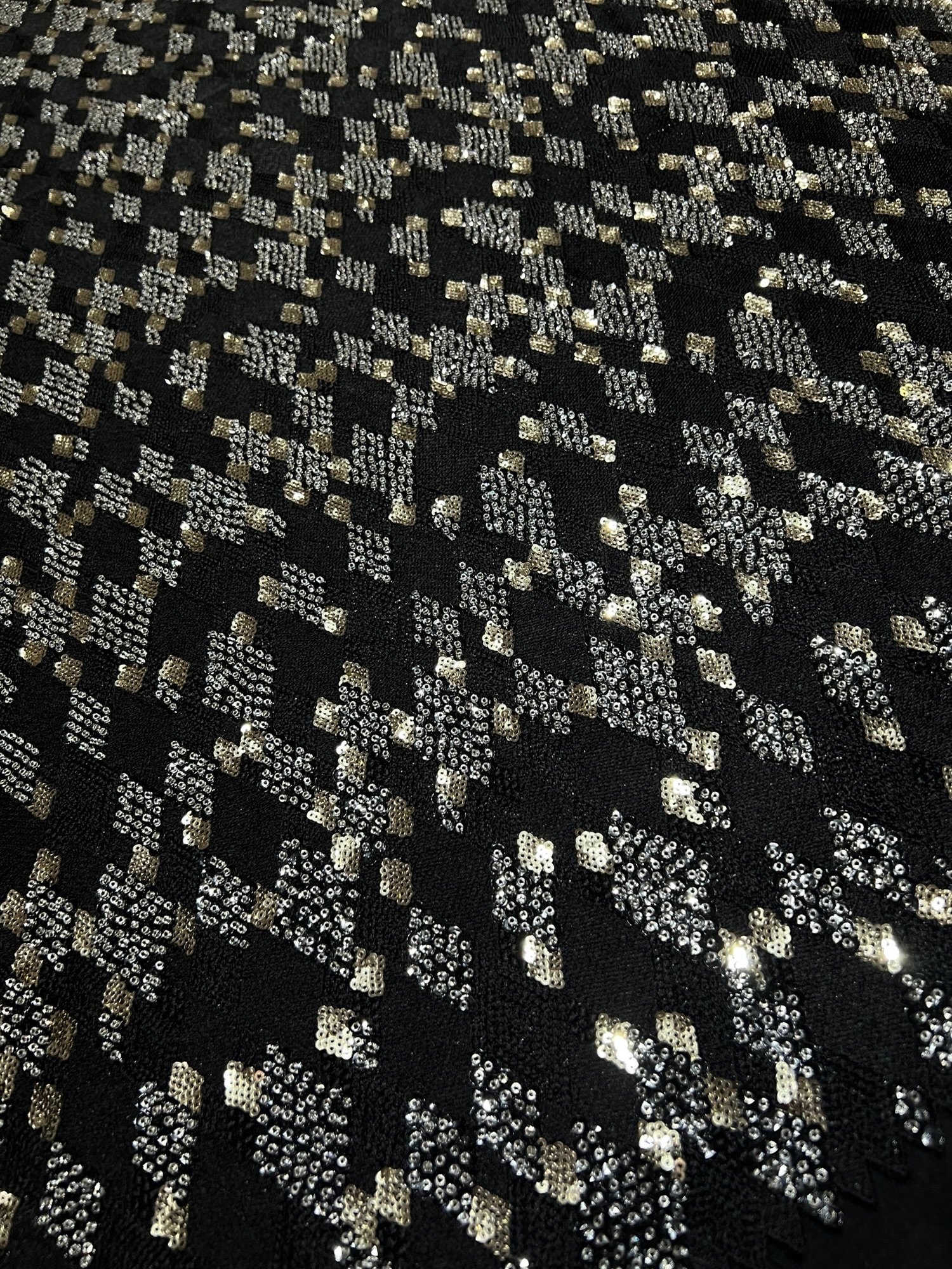 Step into bold sophistication with Maria, a striking black fabric where shimmering gold and silver accents create a luxurious geometric pattern. Designed for high-impact couture, it brings instant glamour and dimension to any creation.