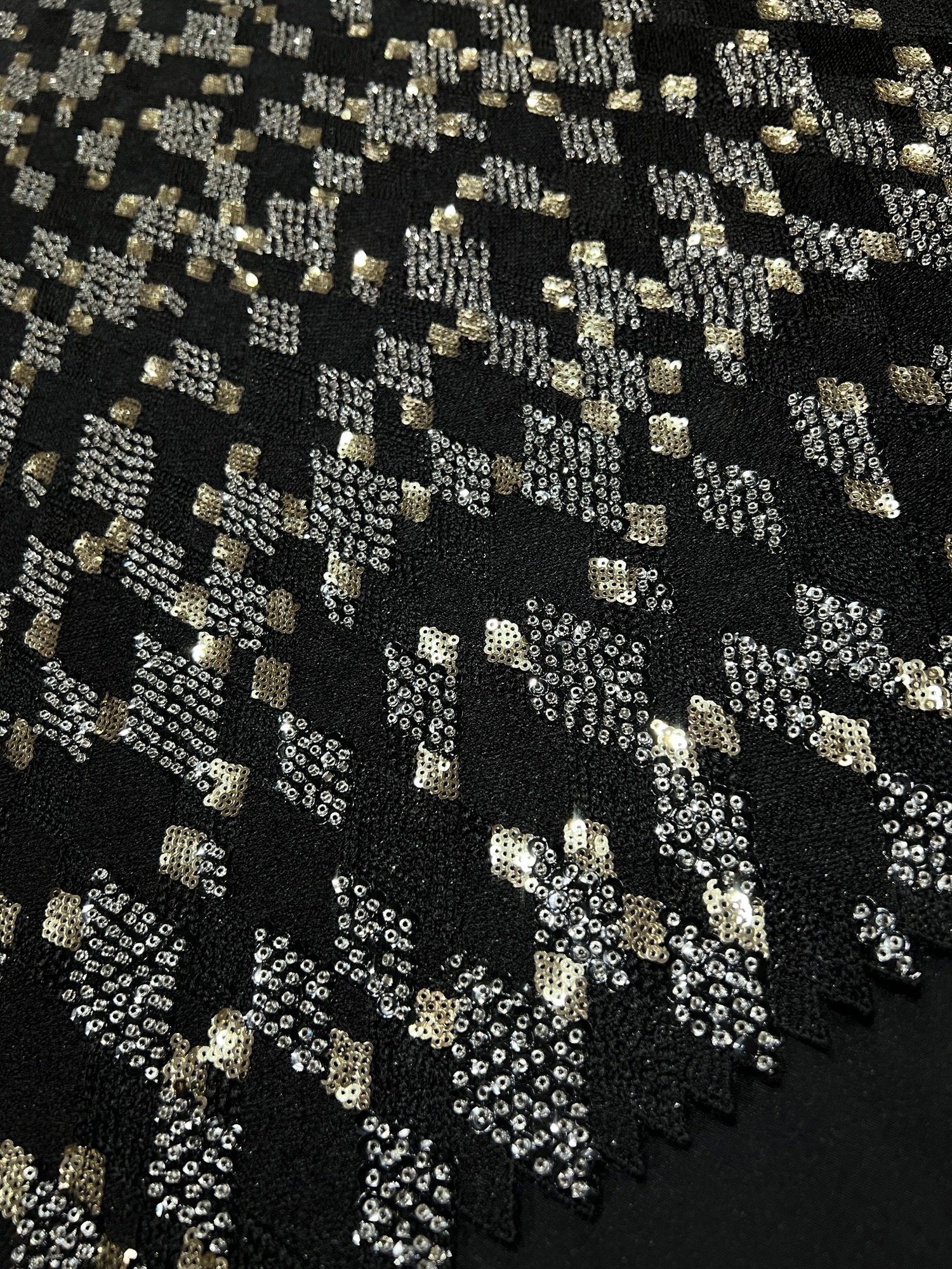 Colour & Fabric: Deep black base intricately adorned with gold and silver metallic embellishments arranged in mosaic-like geometric shapes.