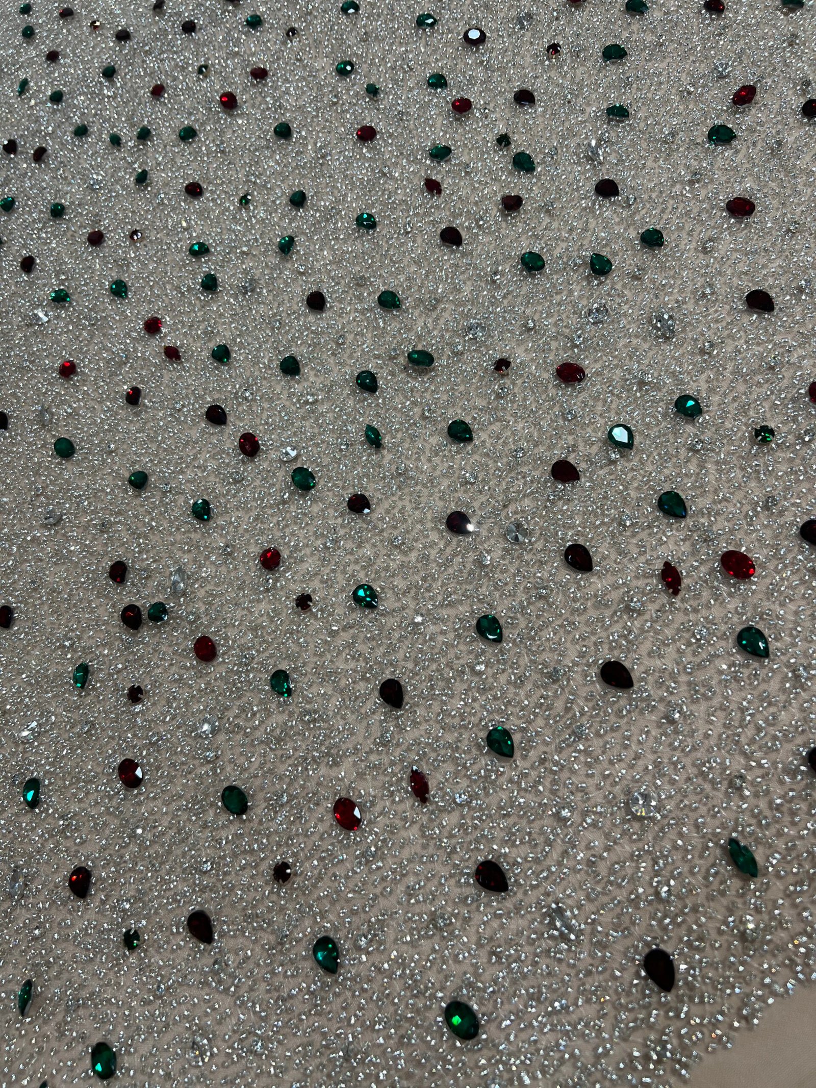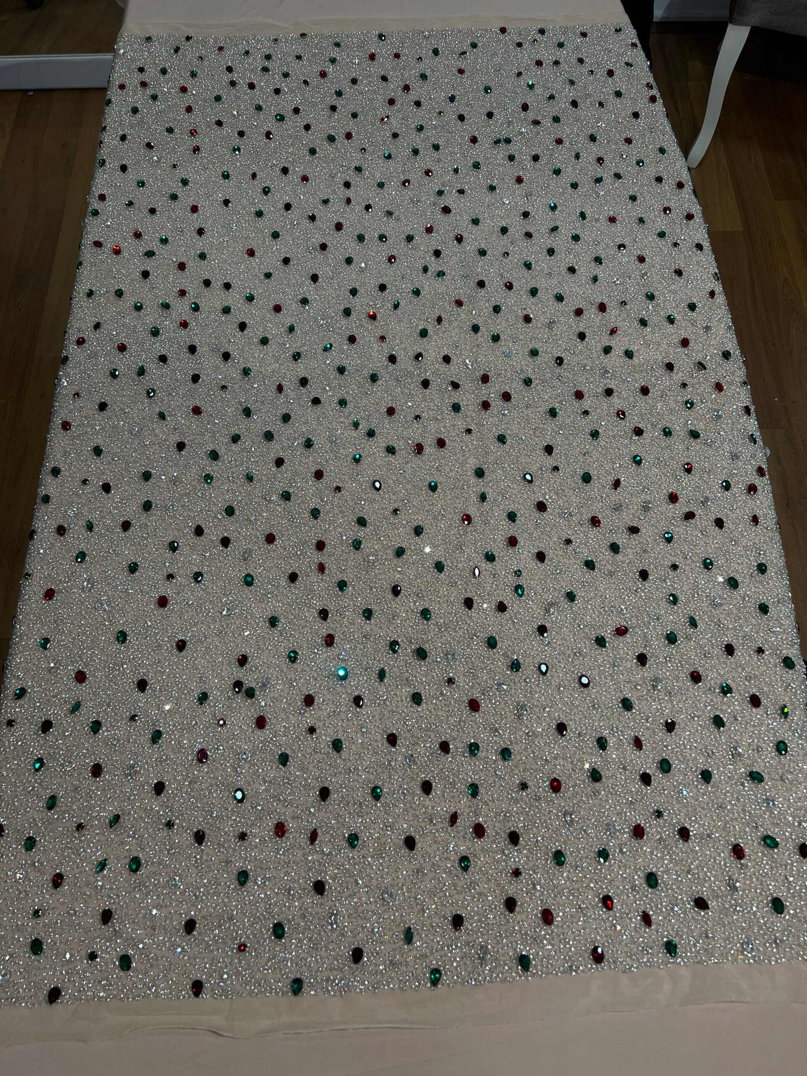 Fabric type: Nude fabric with dense silver bead and colorful stone embellishments