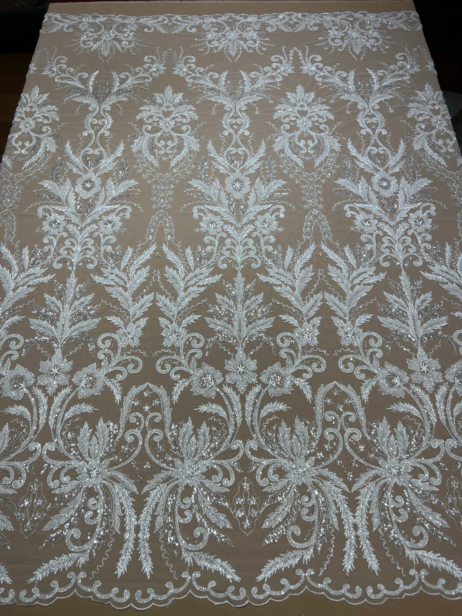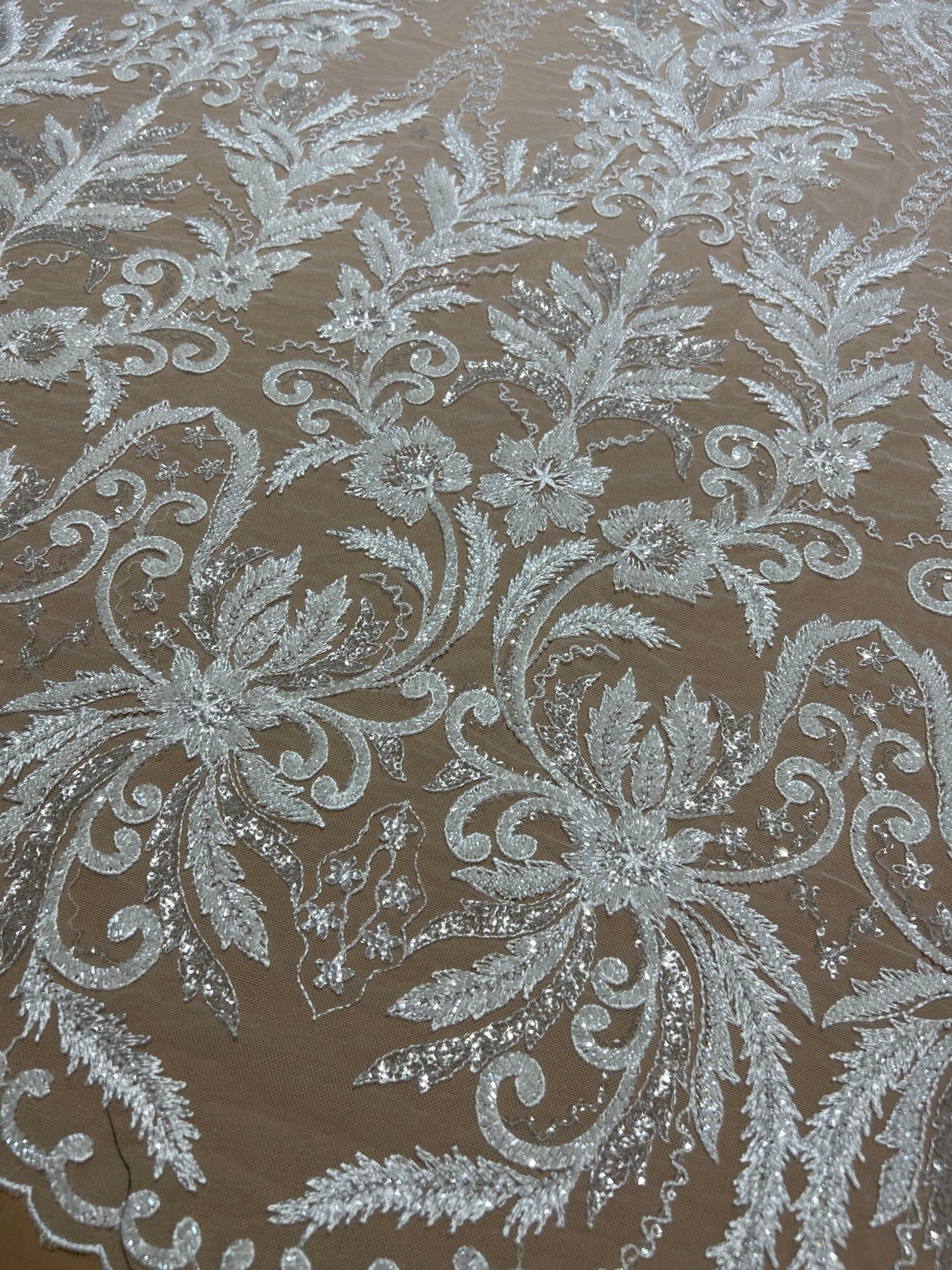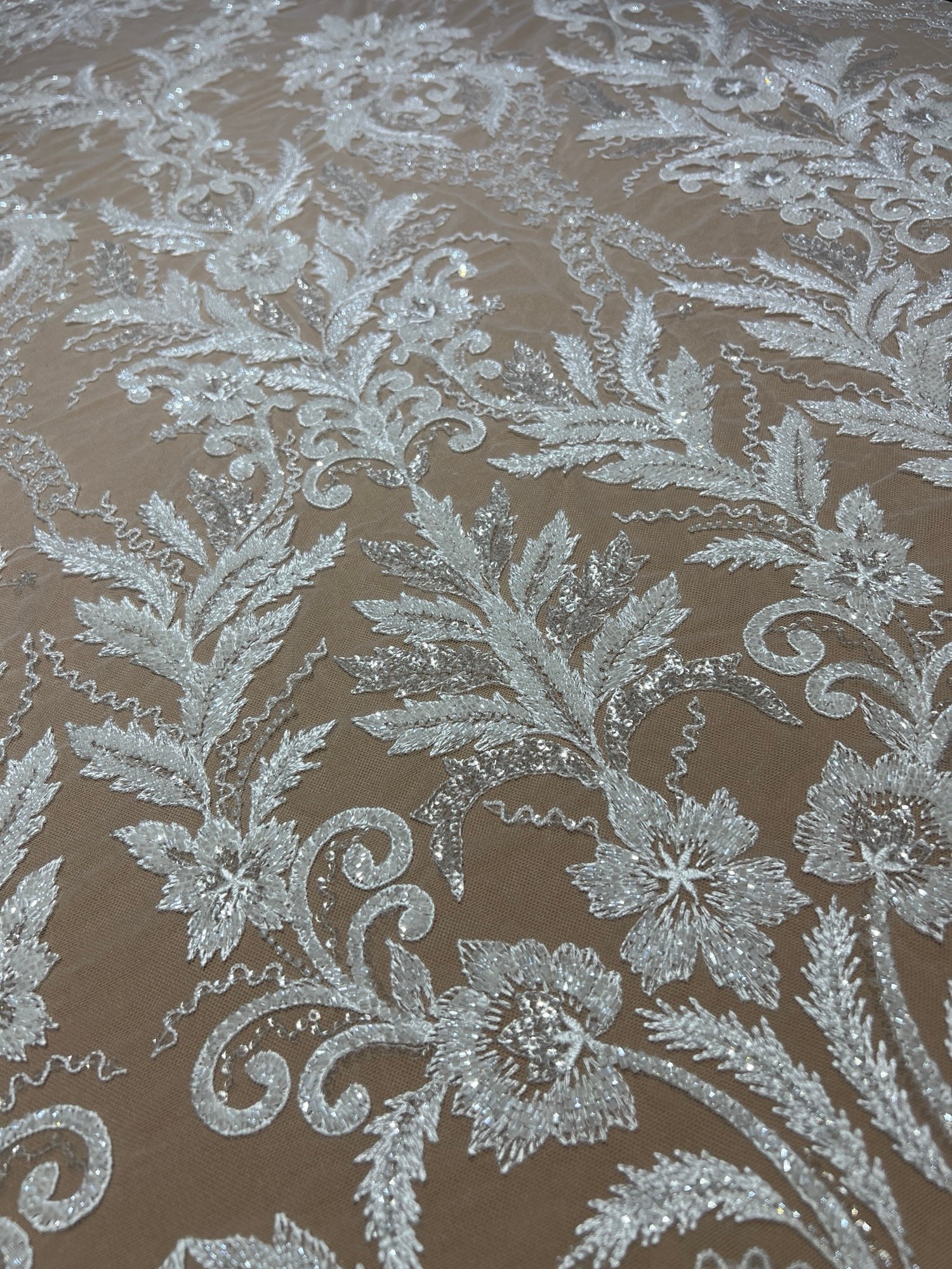Fabric type: Bridal lace with floral and leaf motifs, hand-beaded