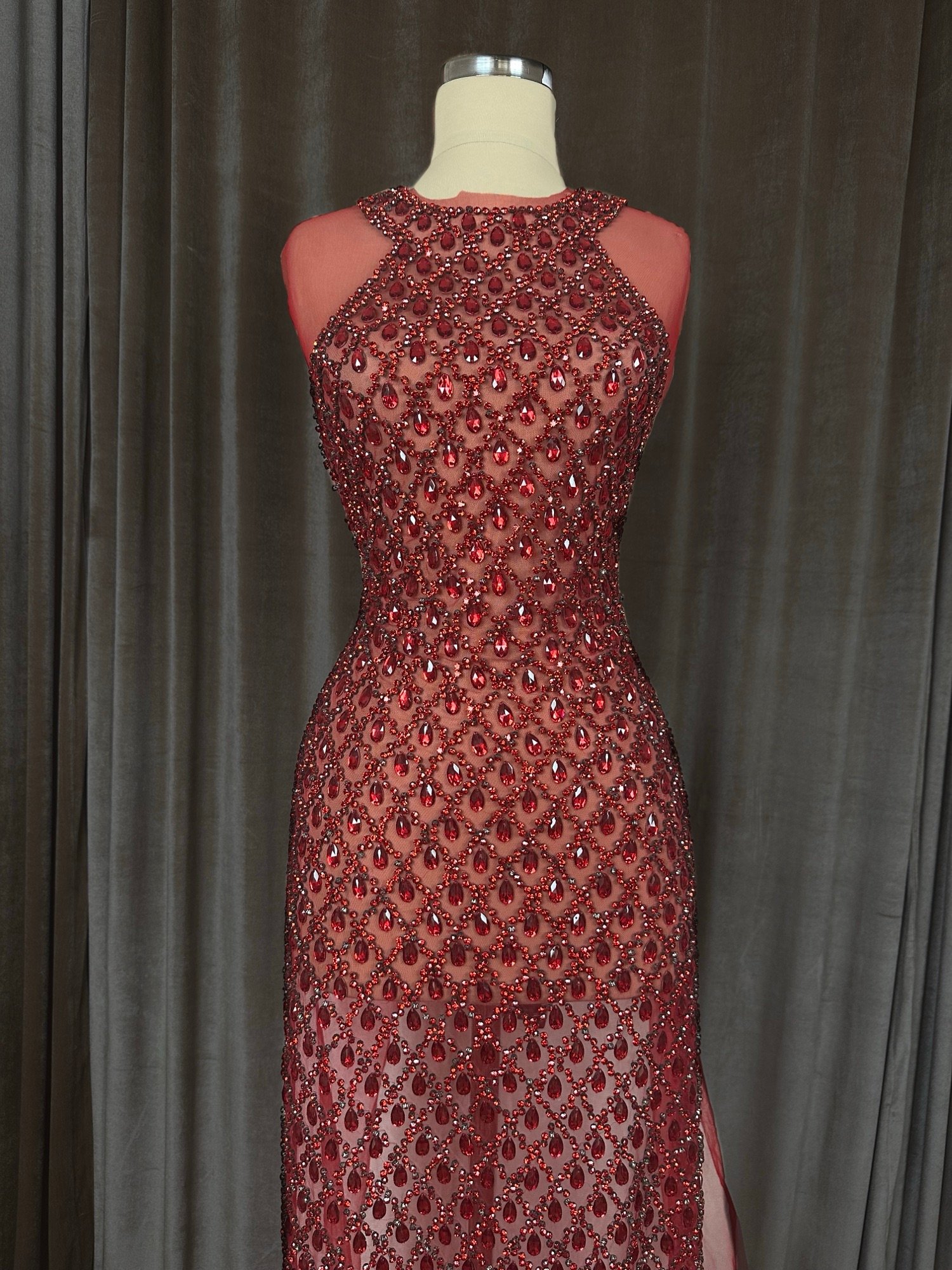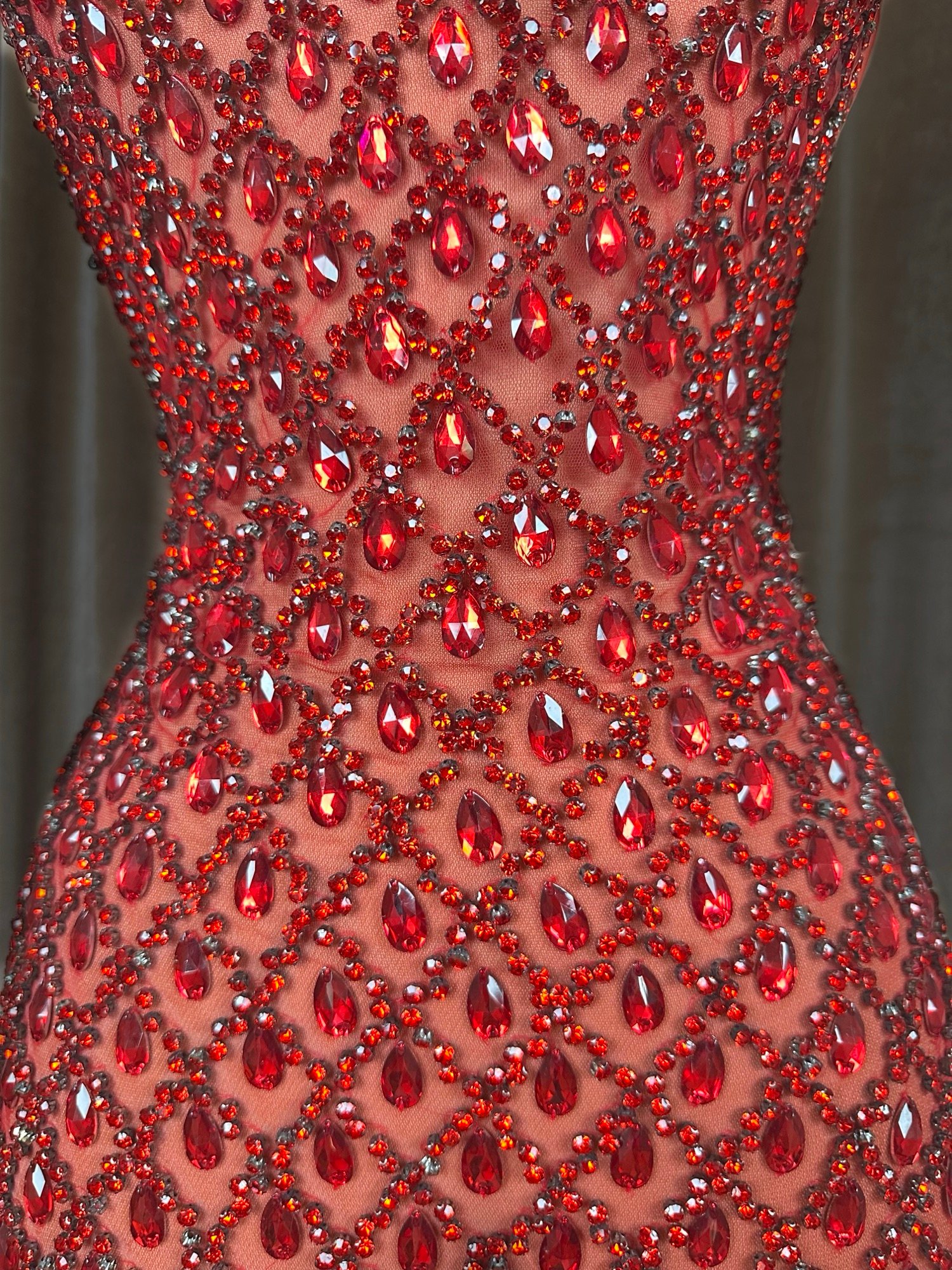 Make an unforgettable entrance with the Scarlet Diamond gown — a striking red evening dress that combines a sleek silhouette with intricate geometric beading.