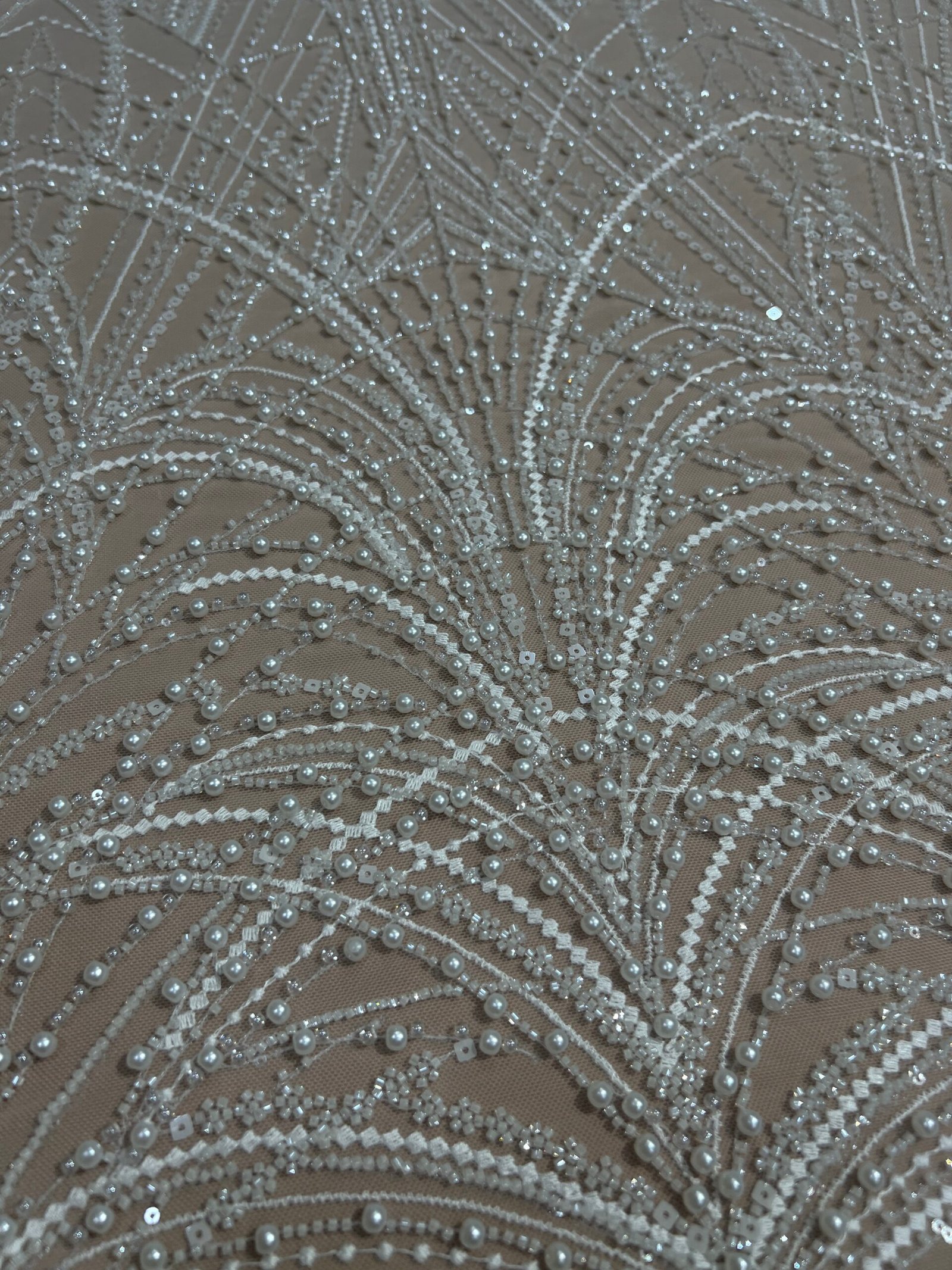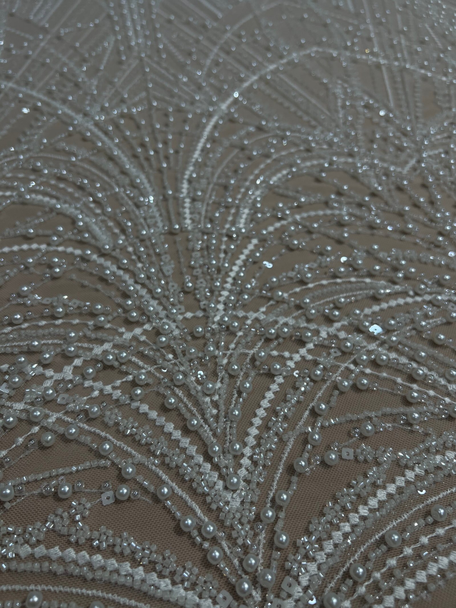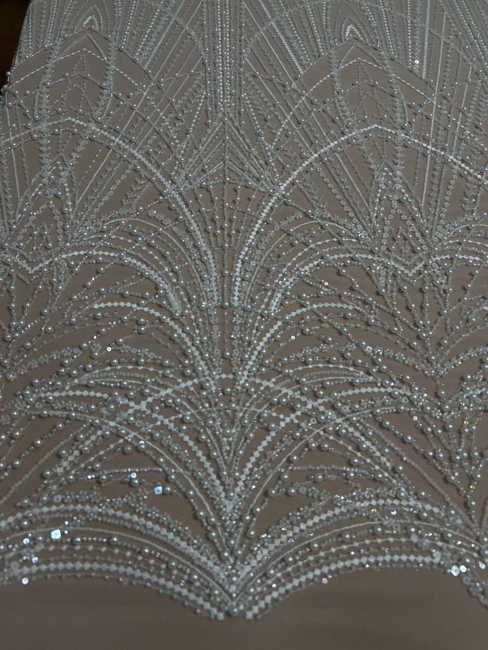 Quenna exudes timeless bridal elegance, featuring a refined symmetric design adorned with soft pearls. Delicate bead embroidery adds texture and a gentle sparkle, perfect for graceful couture creations.