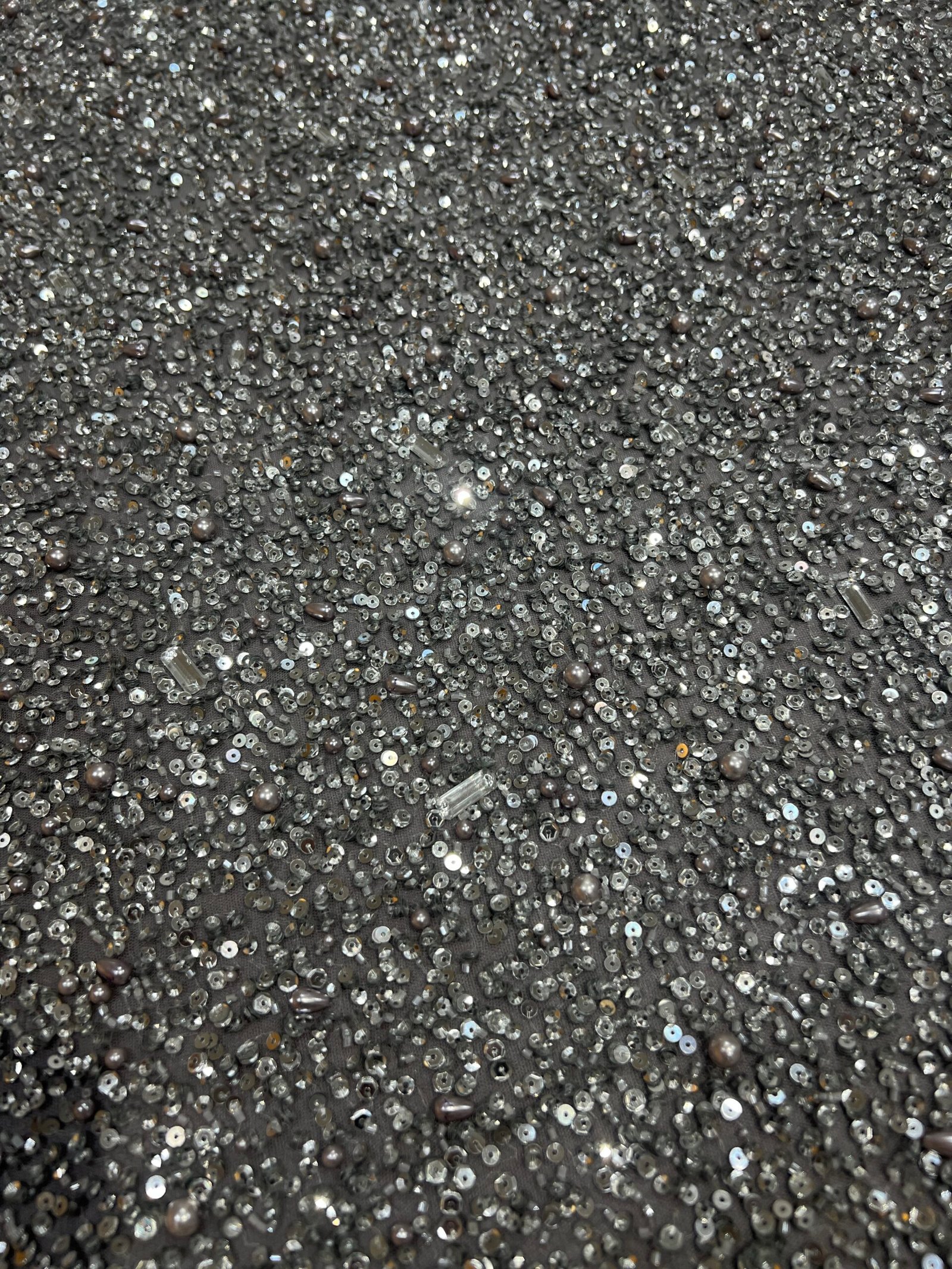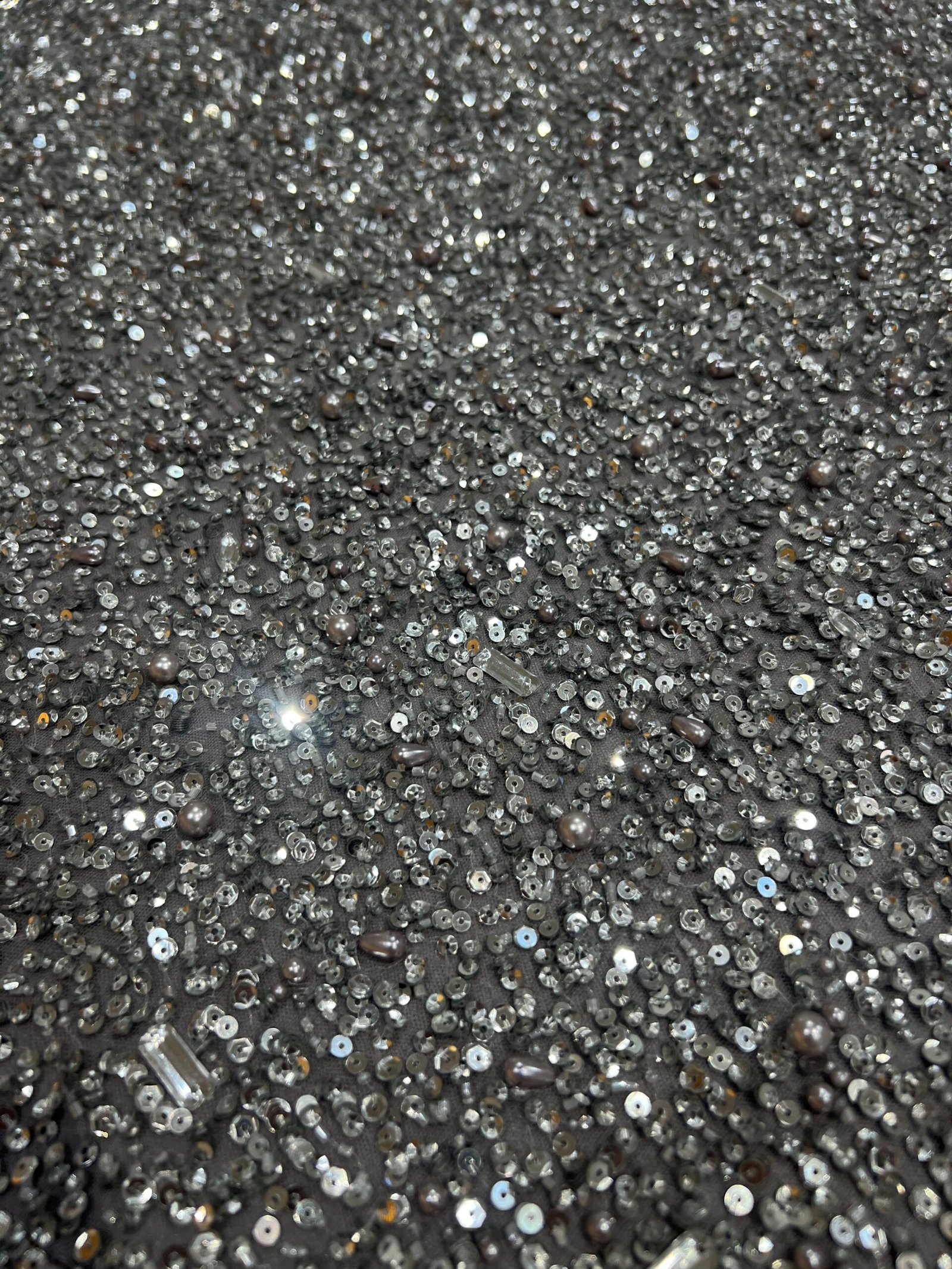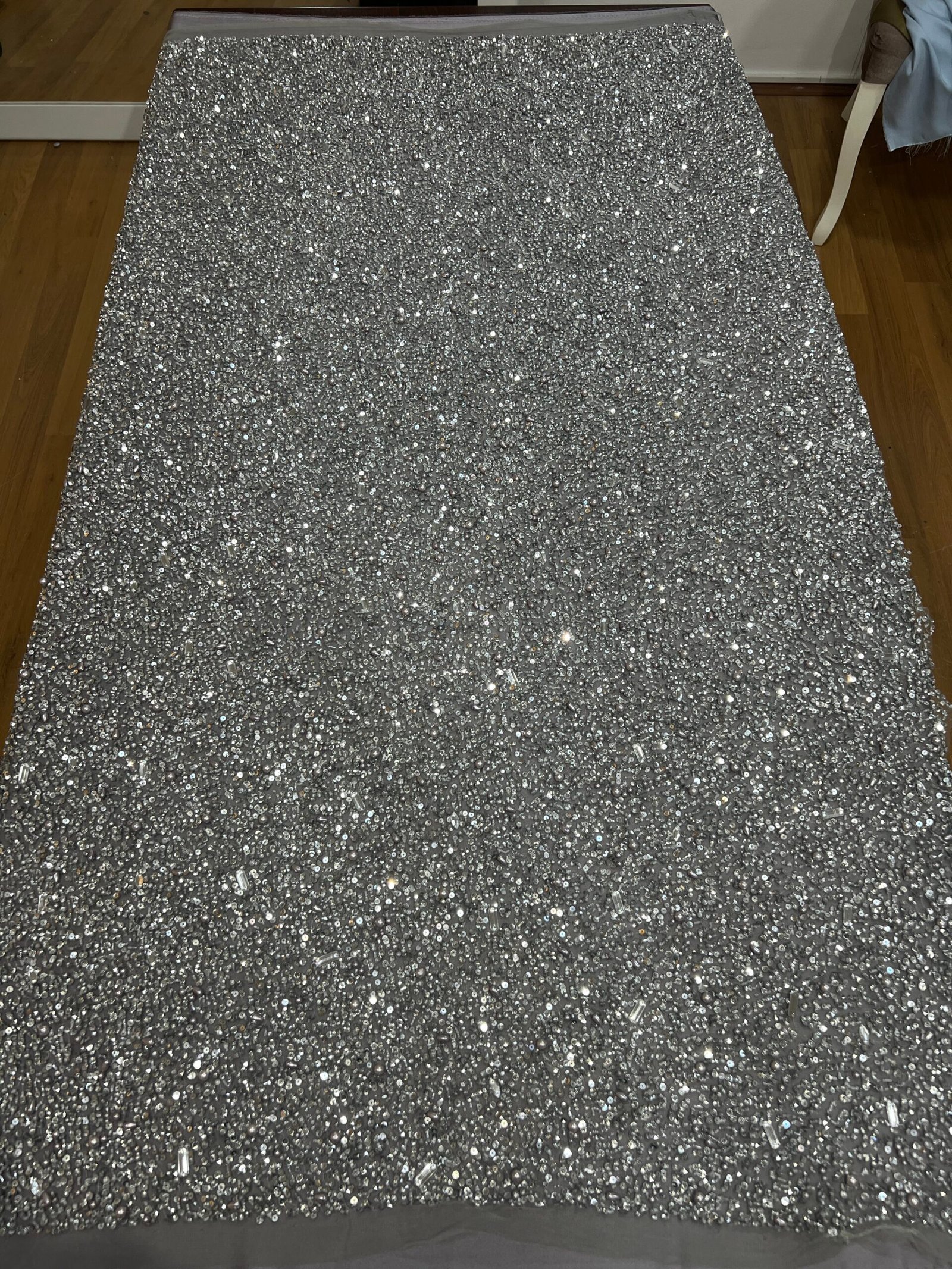 Fabric type: Silver grey fabric with dense bead and stone embellishments