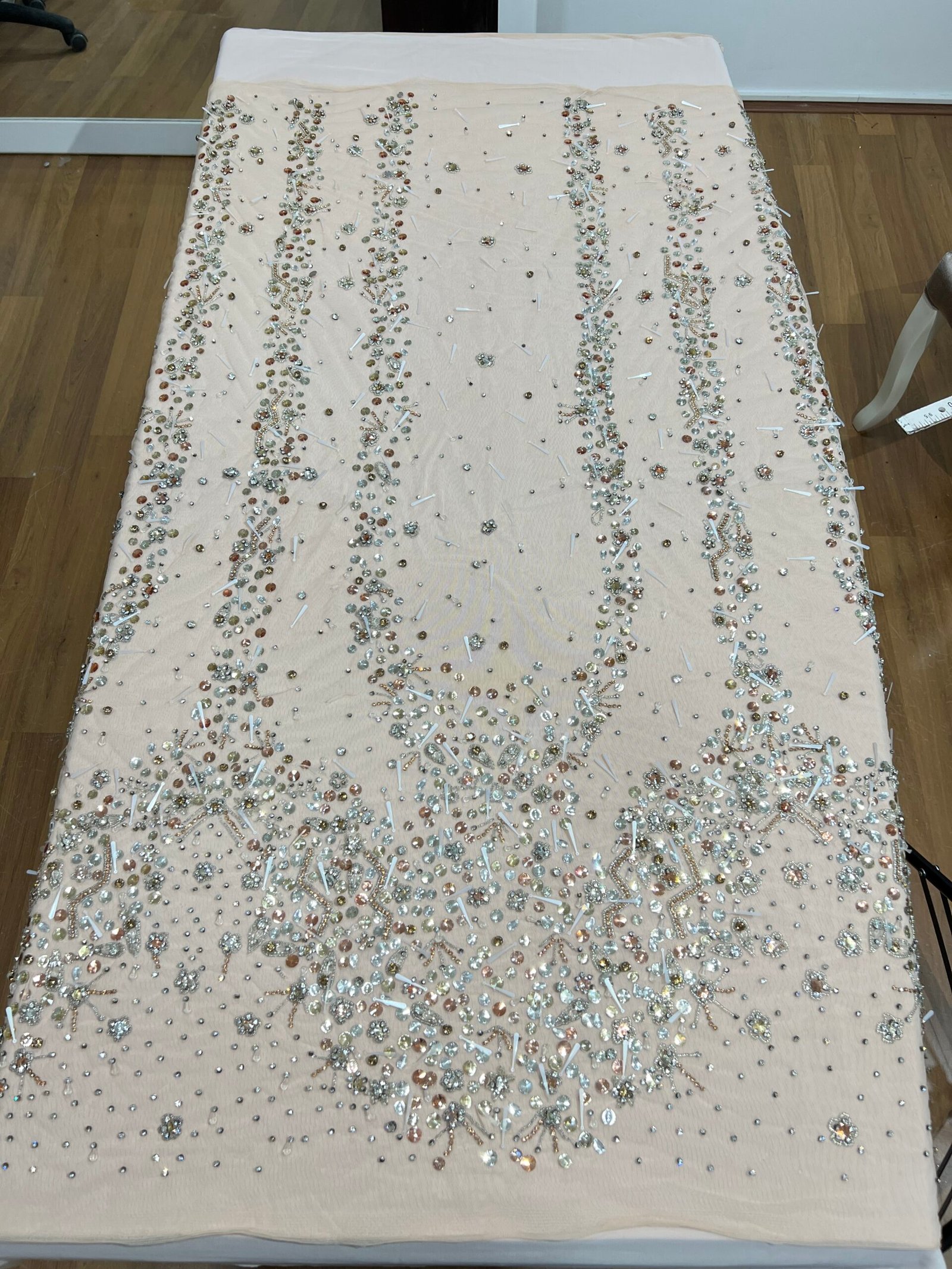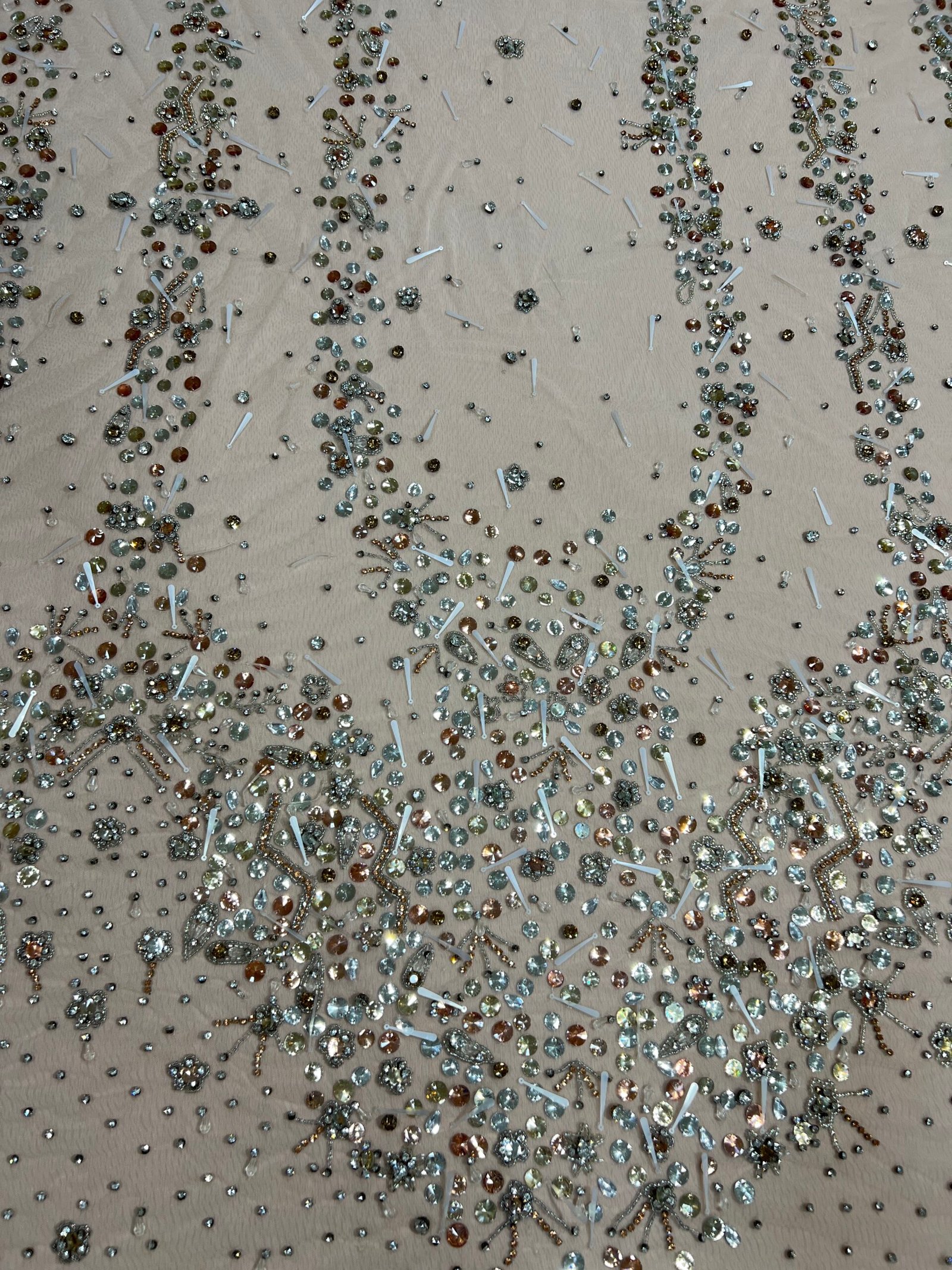 Vanta is an elegant nude fabric designed to bring refinement and glamour to couture creations. With a seamless linear pattern adorned with rose gold, warm brown beads, and shimmering silver stones, it combines timeless texture with a modern, radiant touch.