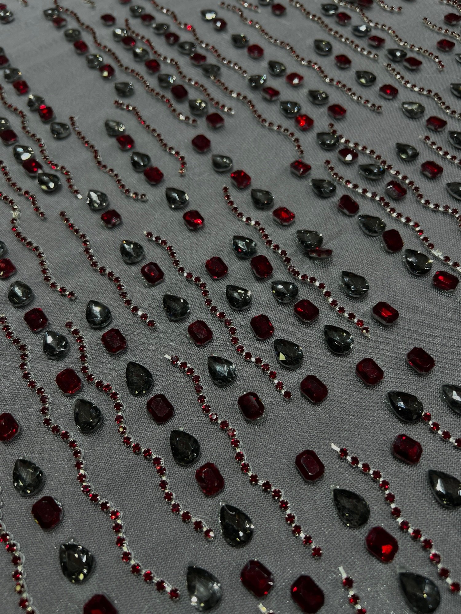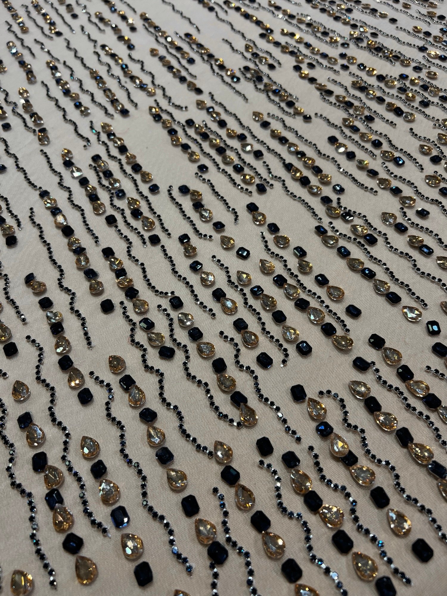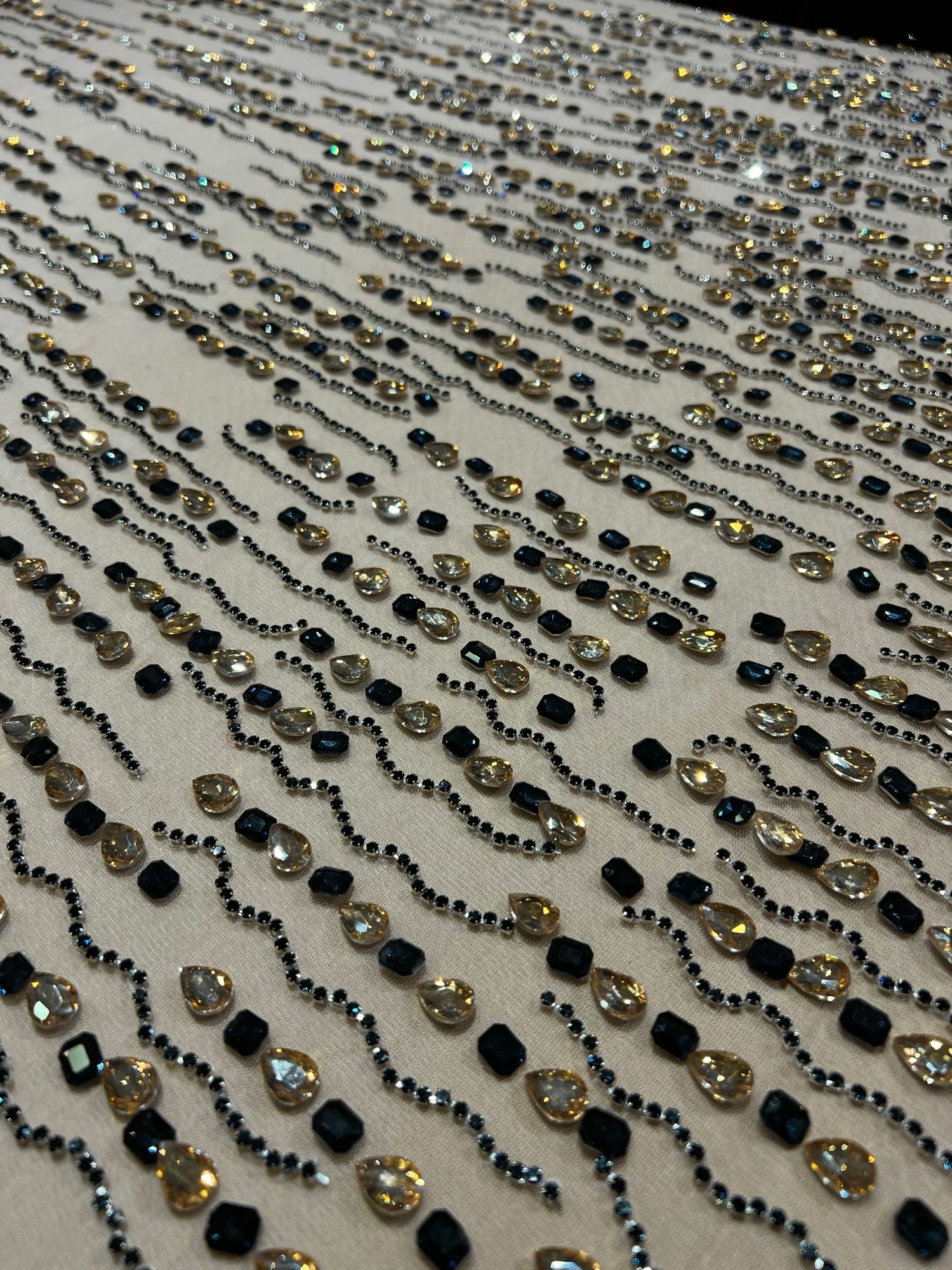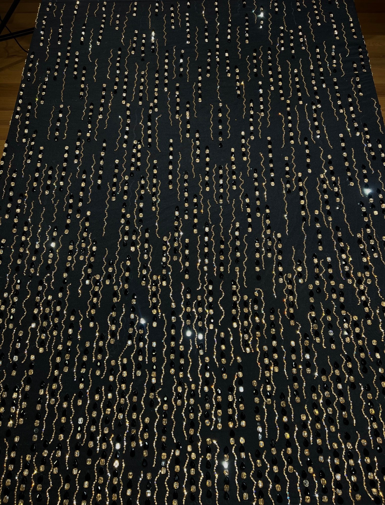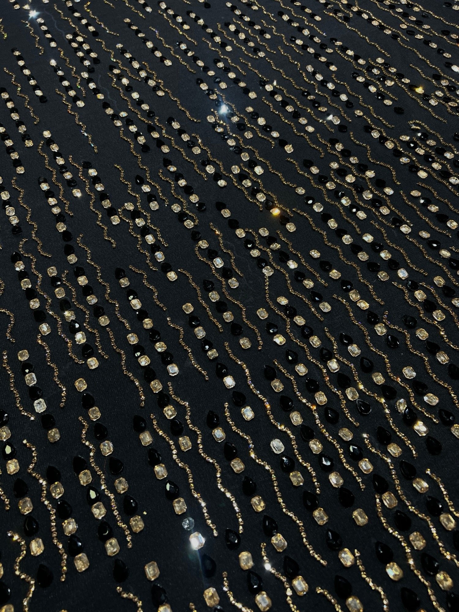 Step into the world of Willia, where timeless elegance meets contemporary opulence. This exquisite black mesh fabric dazzles with cascading lines of gold and crystal stones, creating a mesmerizing play of light and contrast — perfect for eveningwear that commands attention with every movement.